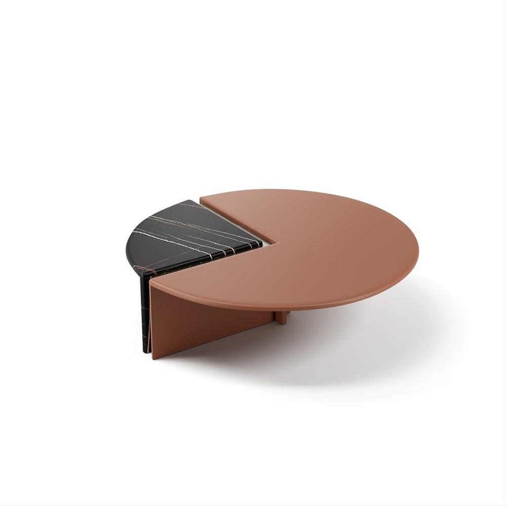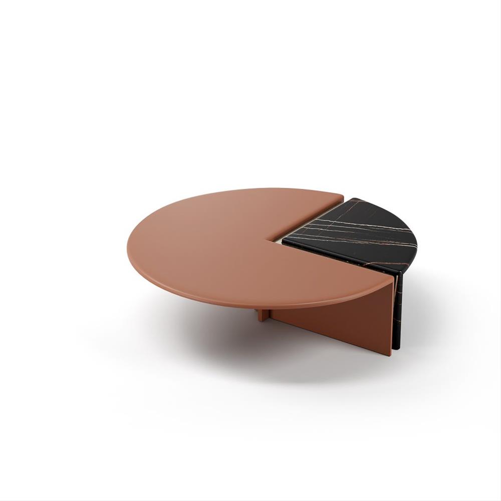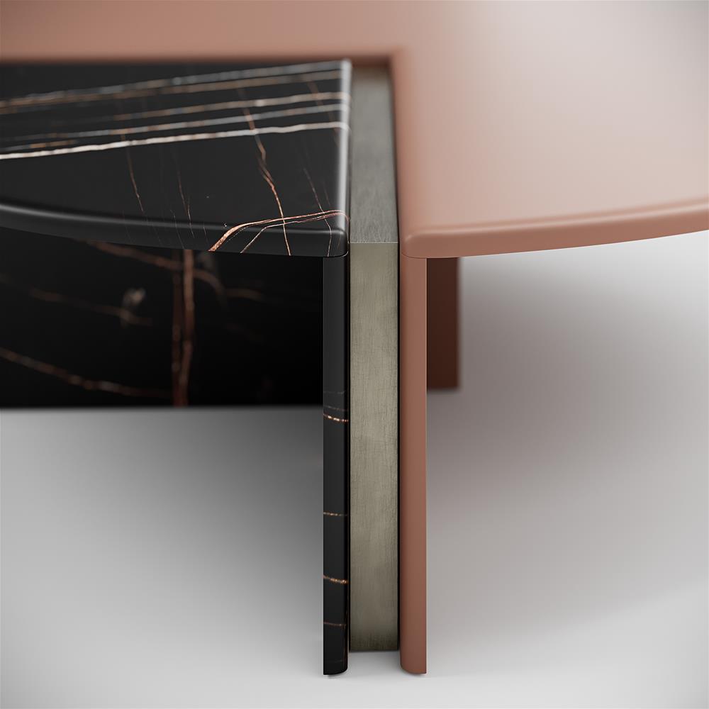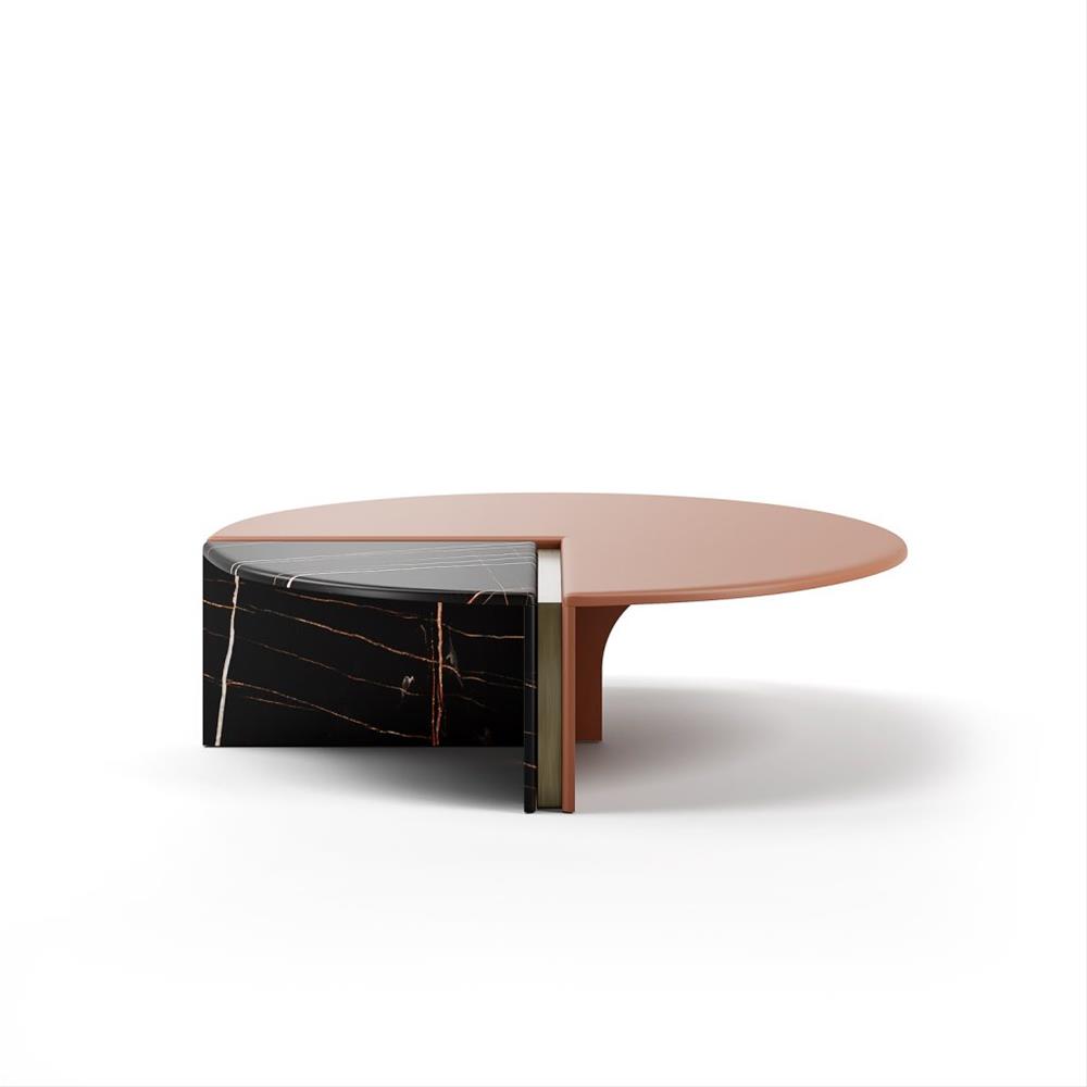 Jeho okrúhly tvar s lakovanou povrchovou úpravou, vyvážený a harmonický, je umocnený exkluzívnou klinovitou mramorovou vložkou, ktorá dodáva nádych luxusu a jedinečnosti. Kovové detaily dotvárajú kompozíciu a vytvárajú dialóg medzi textúrami a farbami. Ilúzia zavesenej plochy dodáva vizuálnu ľahkosť, vďaka čomu je ideálna na obohatenie obytného priestoru o eleganciu a charakter.