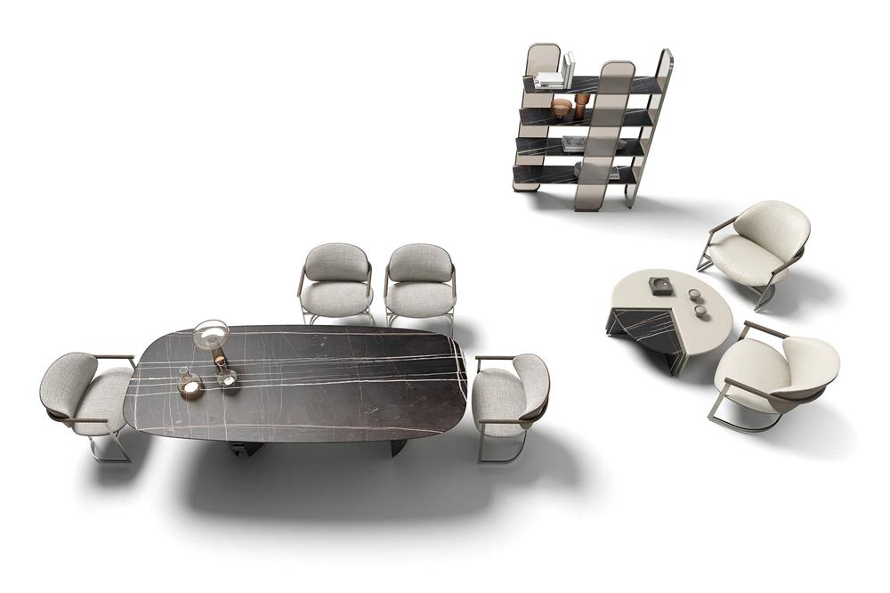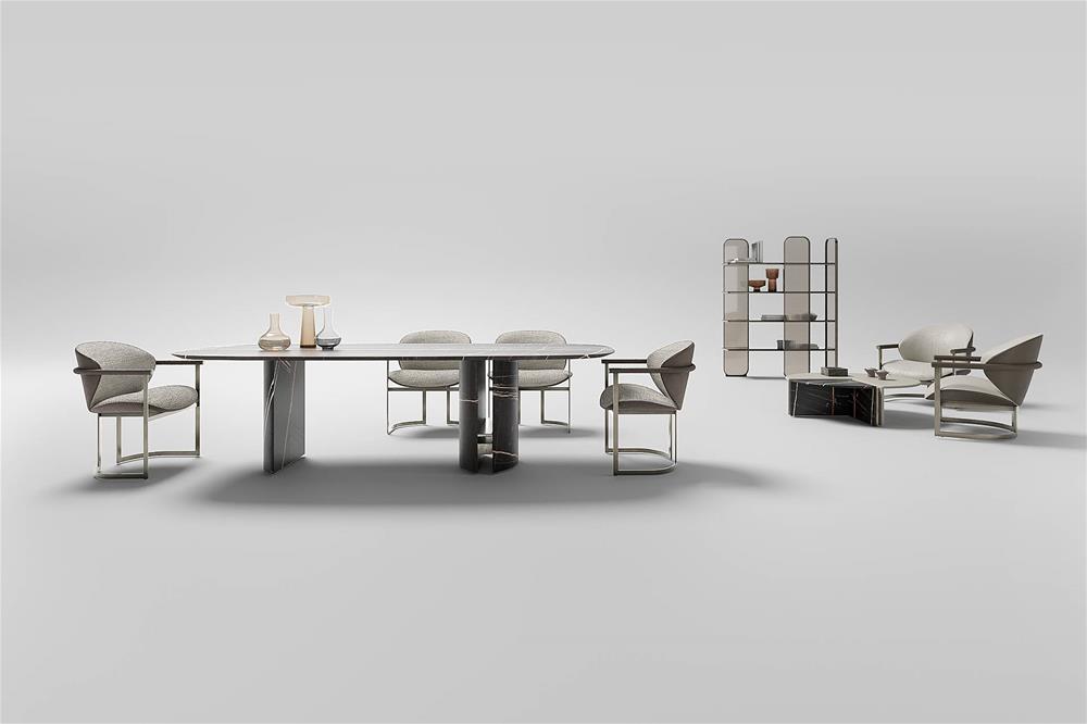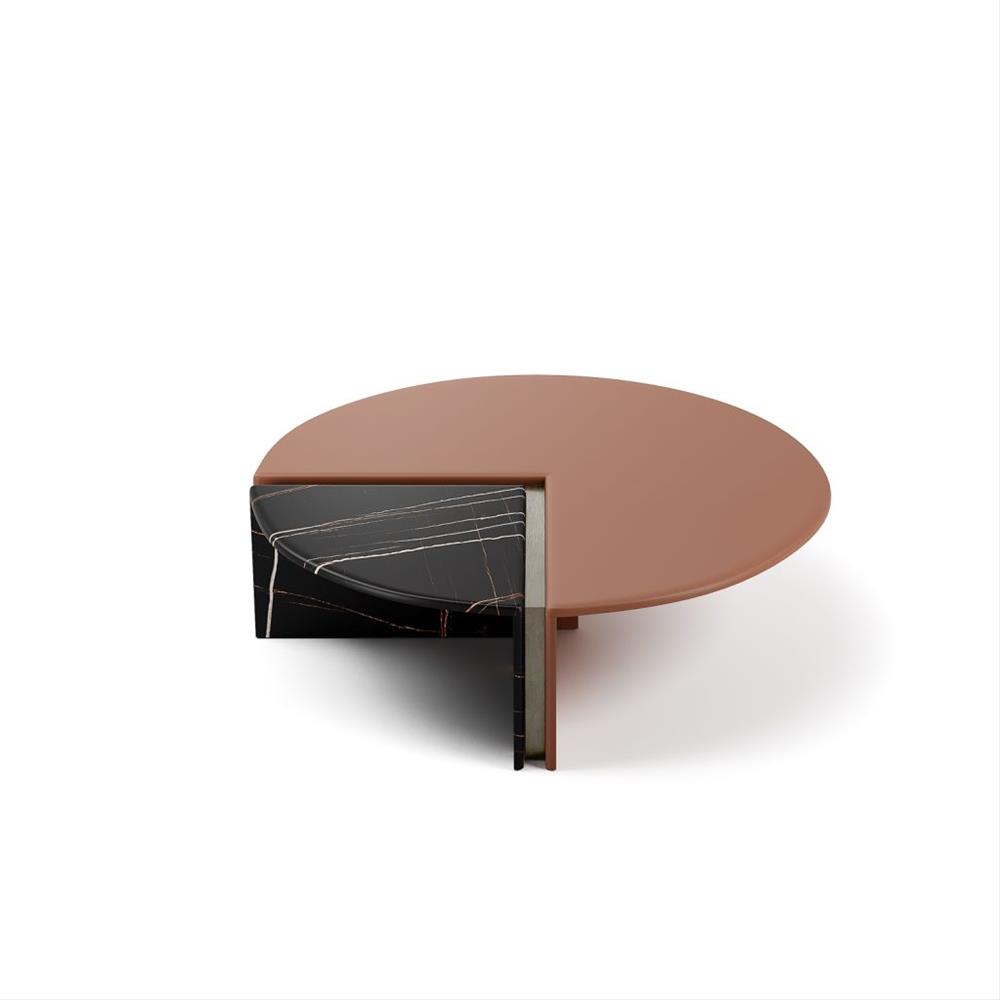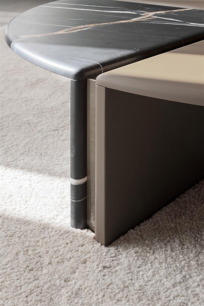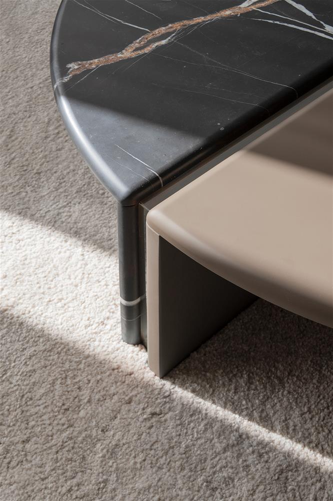 Jeho okrúhly tvar s lakovanou povrchovou úpravou, vyvážený a harmonický, je umocnený exkluzívnou klinovitou mramorovou vložkou, ktorá dodáva nádych luxusu a jedinečnosti. Kovové detaily dotvárajú kompozíciu a vytvárajú dialóg medzi textúrami a farbami. Ilúzia zavesenej plochy dodáva vizuálnu ľahkosť, vďaka čomu je ideálna na obohatenie obytného priestoru o eleganciu a charakter.