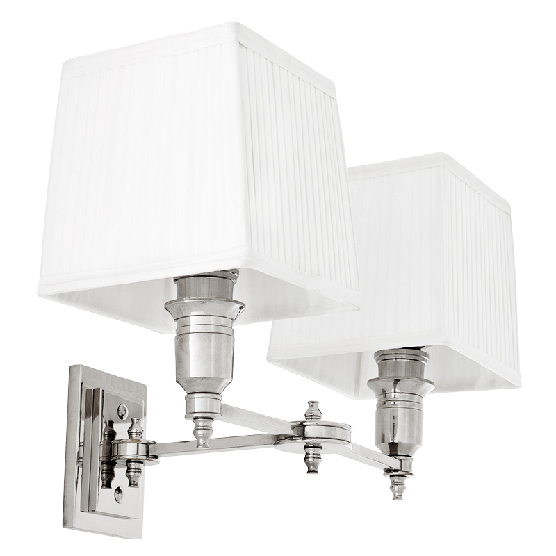 Strieborná nástenná lampa Lexington Double s bielymi prekladanými tienidlami z dielne Eichholtz. Rozmery: výška 27cm, šírka 40cm, hĺbka 23cm Kód: 108636 Pre kompletnú ponuku exkluzívneho nábytku, svietidiel a doplnkov navštívte stránku www.eichholtz.com. Zašlite nám kód produktu a my Vám vytvoríme cenovú ponuku.