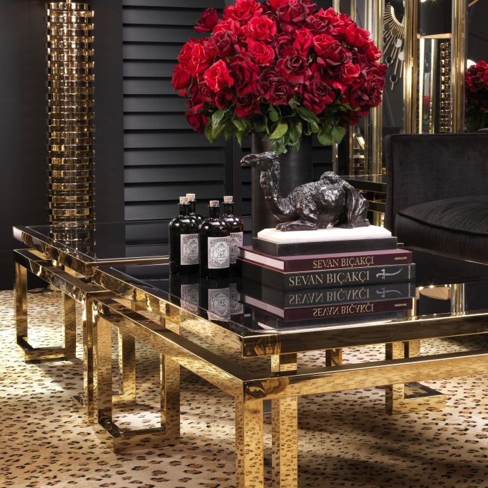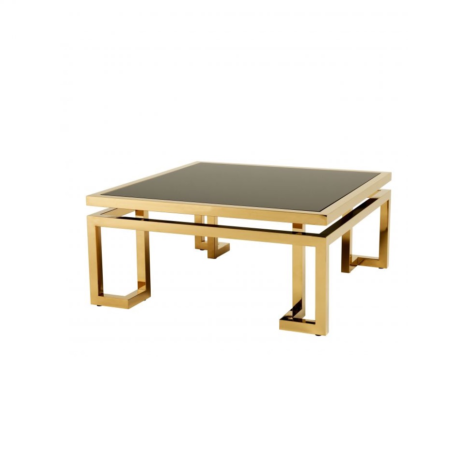 Vysokoleštený oceľový konferenčný stolík Palmer v zlatom prevedení s čiernym dymovým sklom.