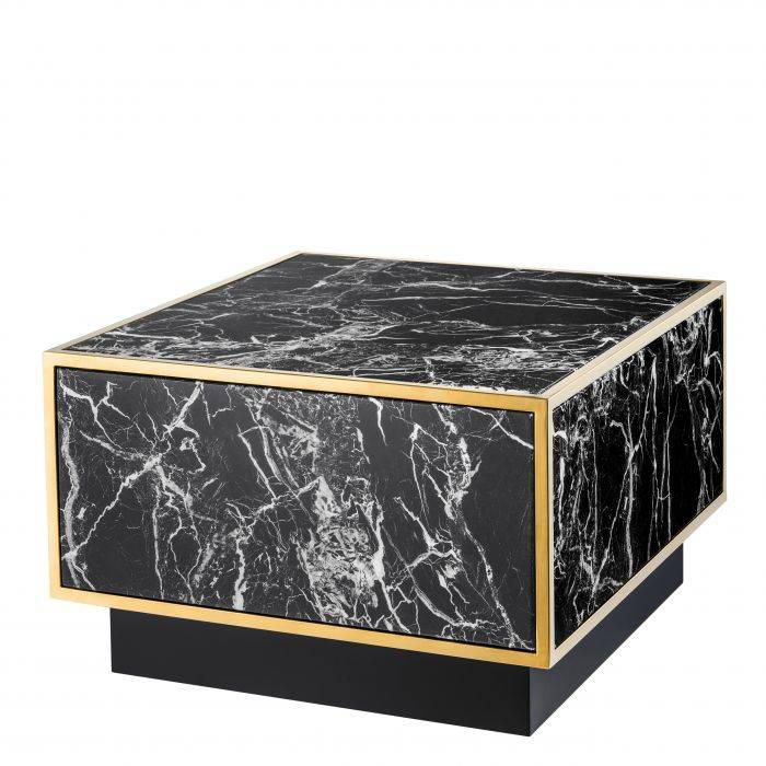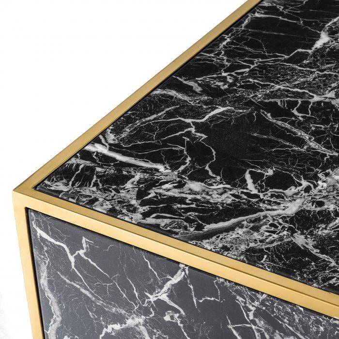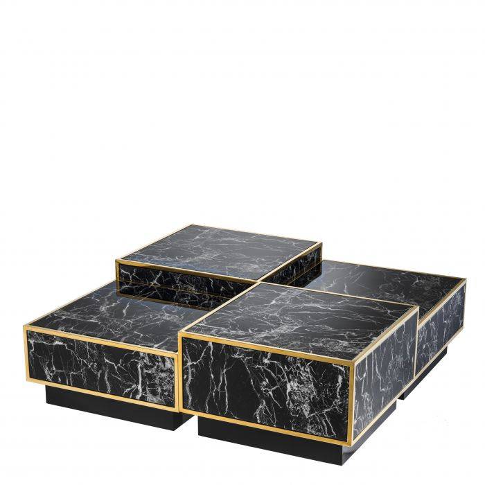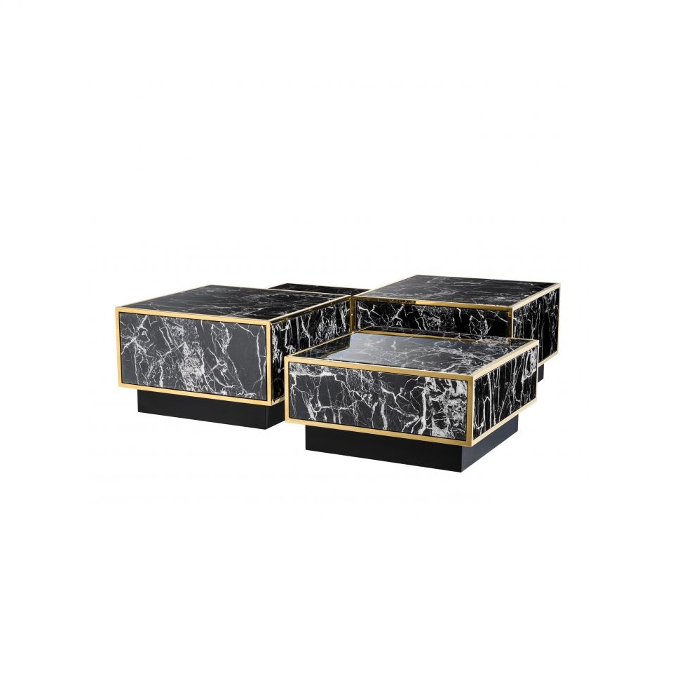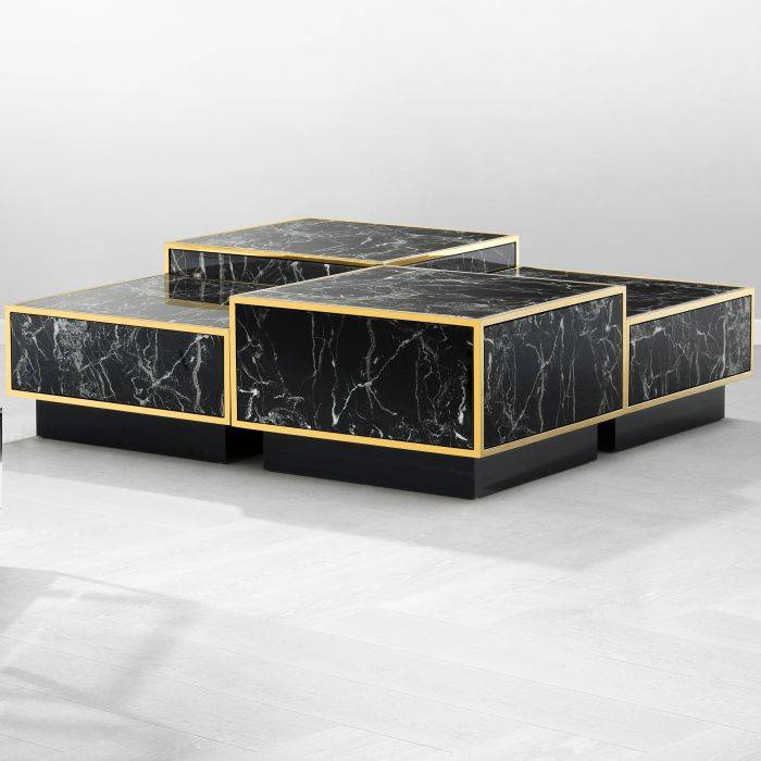 Set štyroch konferenčných stolíkov Concordia s kompozitným čiernym mramorom a zlatými kovovými linkami.