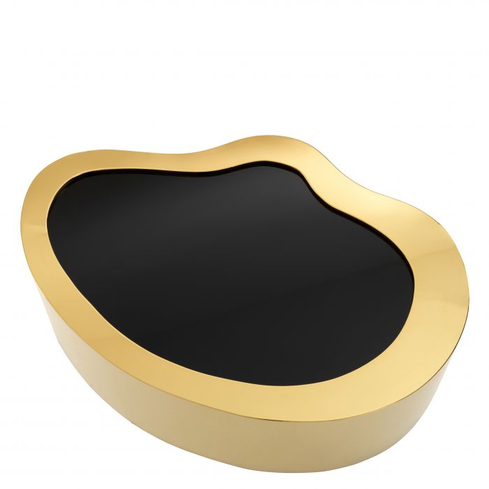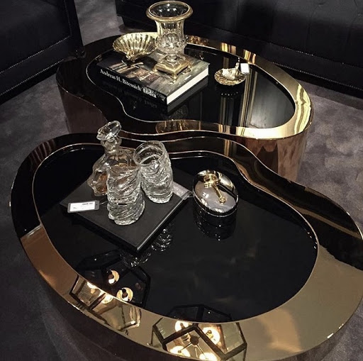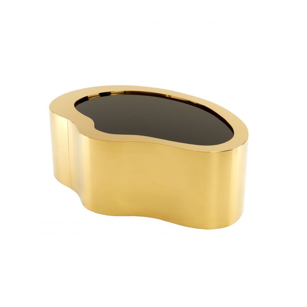 Dizajnový konferenčný stolík z vysokoleštenej ocele v zlatom prevedení s čiernym sklom.