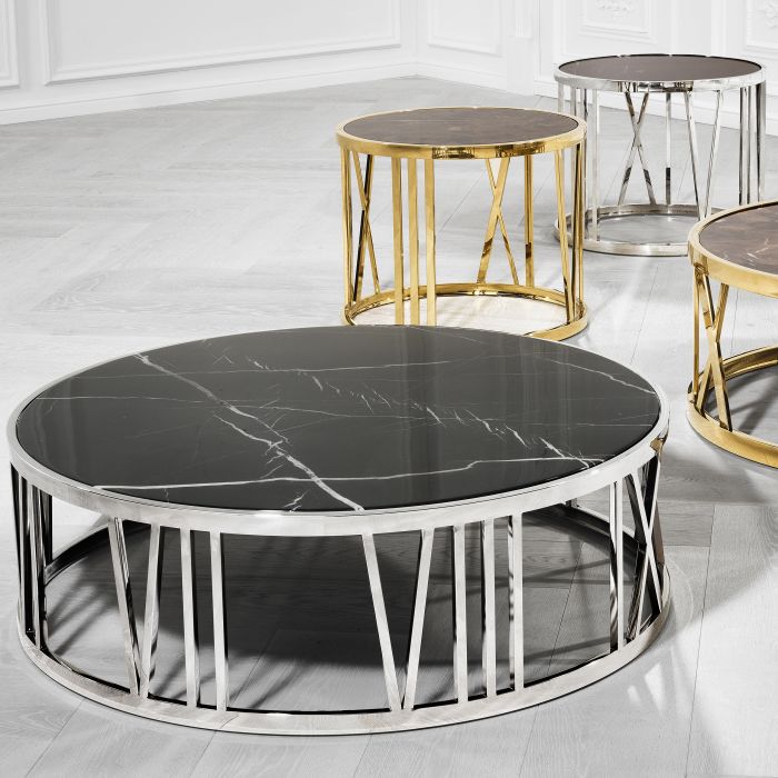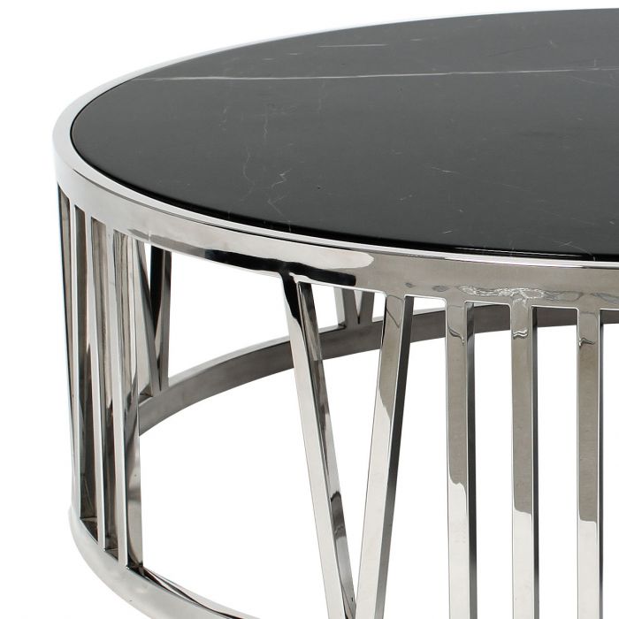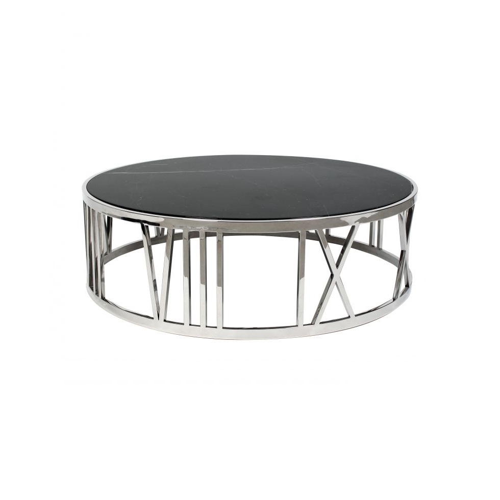 Okrúhly konferenčný stolík Baccarat s dizajnom rímskych čísel z vysokoleštenej ocele s čiernym mramorom.