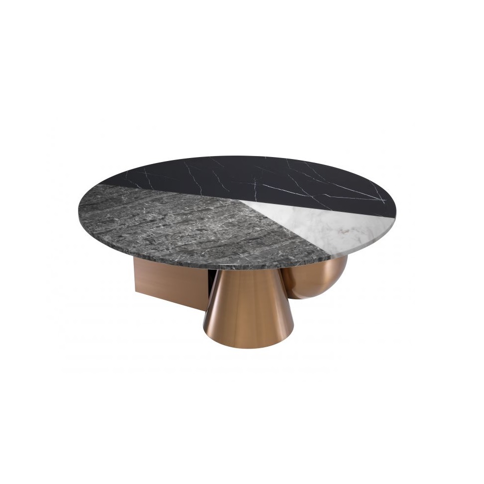 Konferenčný stolík z kompozitného mramoru s matným medeným základom.