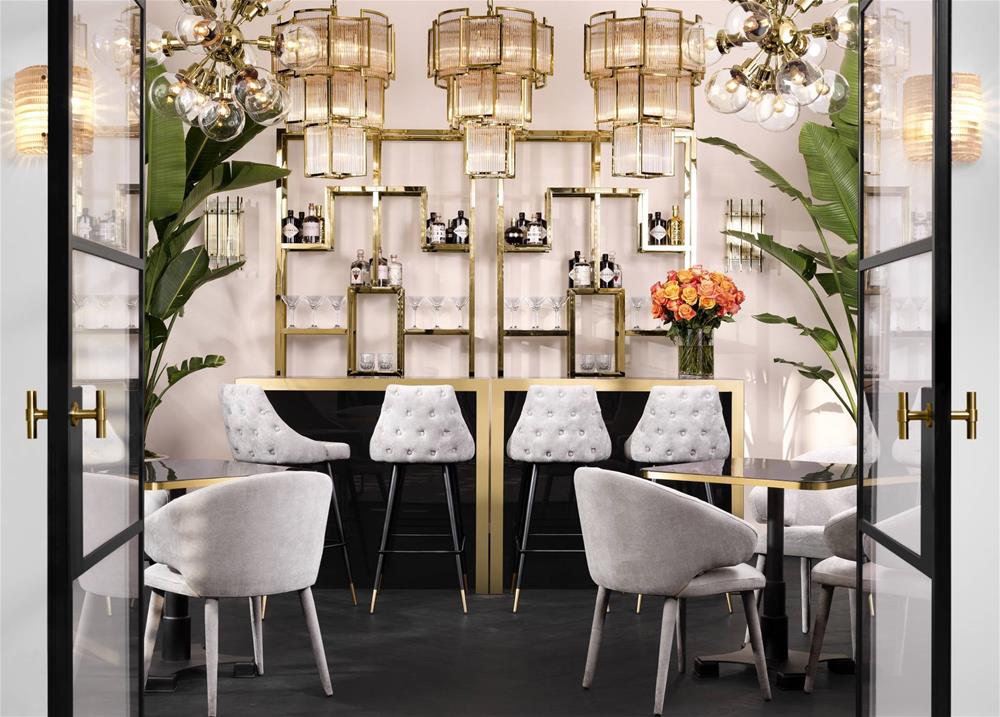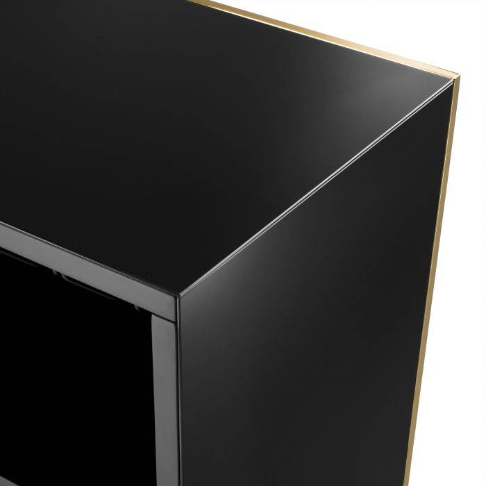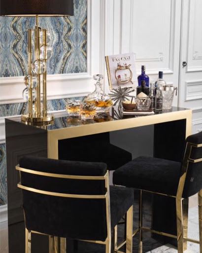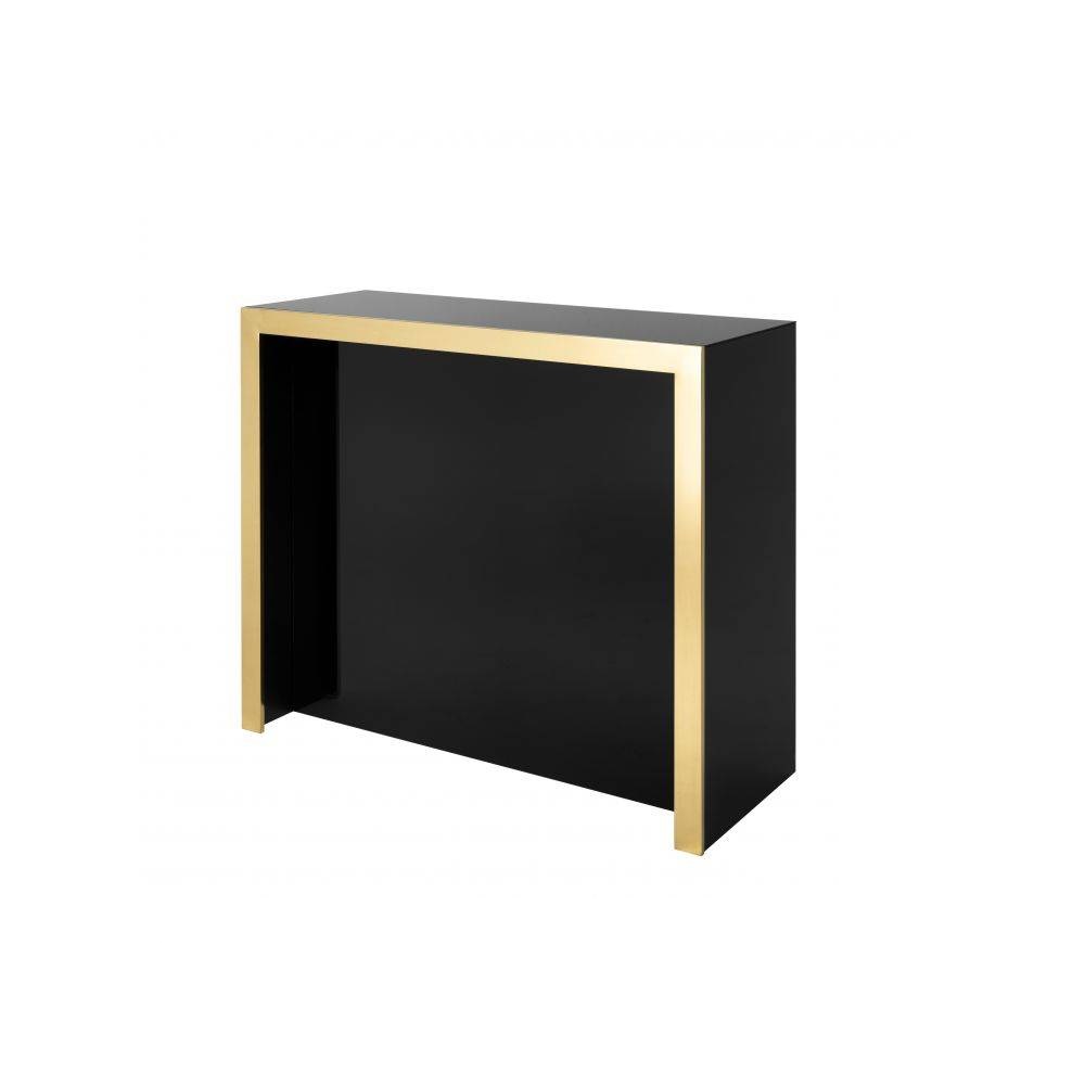 Barový pult Grimaldi s čiernym sklom a lemom z vysokoleštenej ocele v zlatom prevedení.