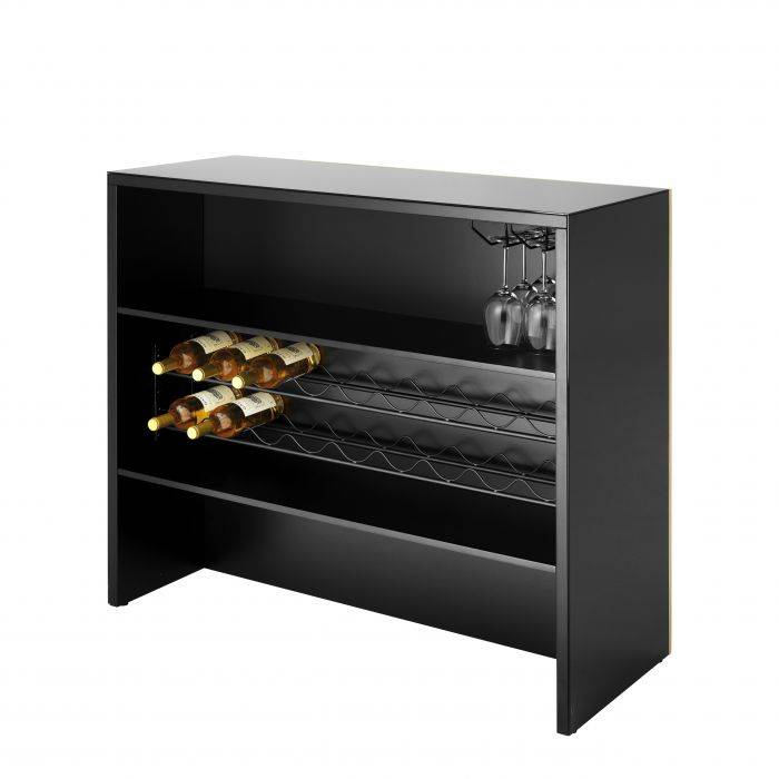 Barový pult obsahuje dve police a kovové konzoly na poháre a fľaše.