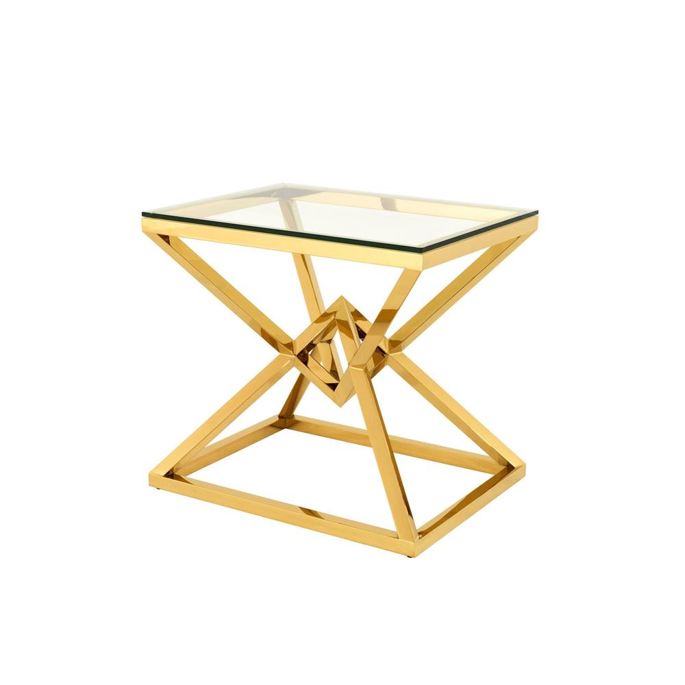 Zlatý príručný stolík z kolekcie Connor z vysokoleštenej ocele s čírym sklom.