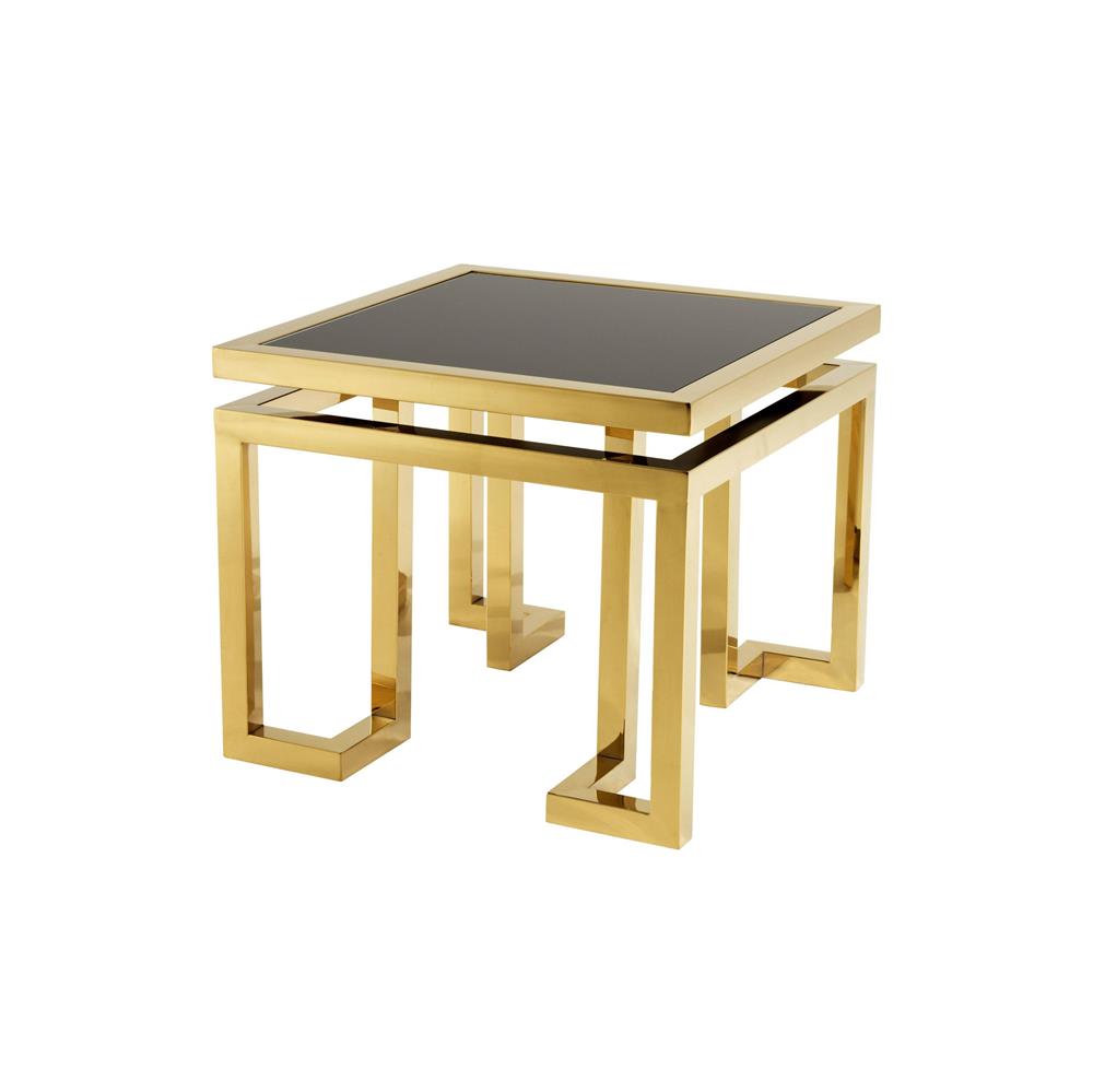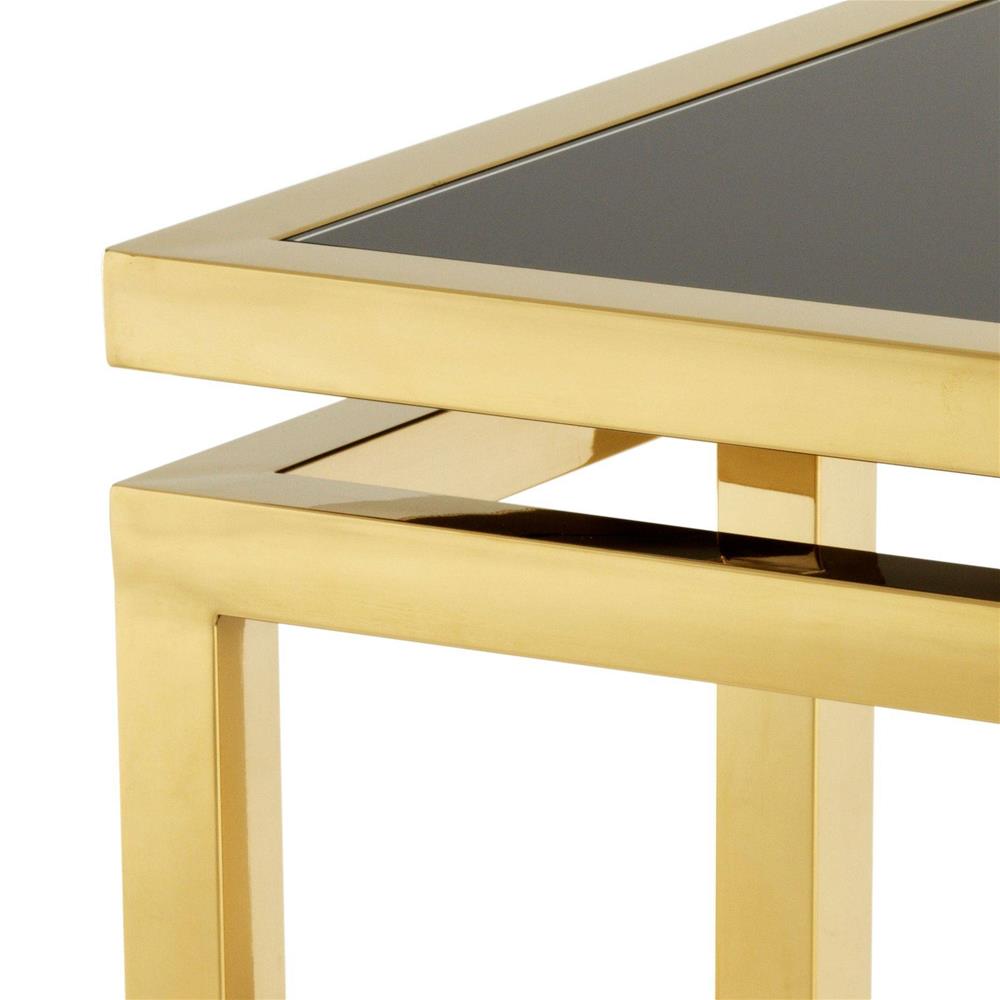 Zlatý vysokoleštený oceľový príručný stolík Palmer s čiernym sklom.