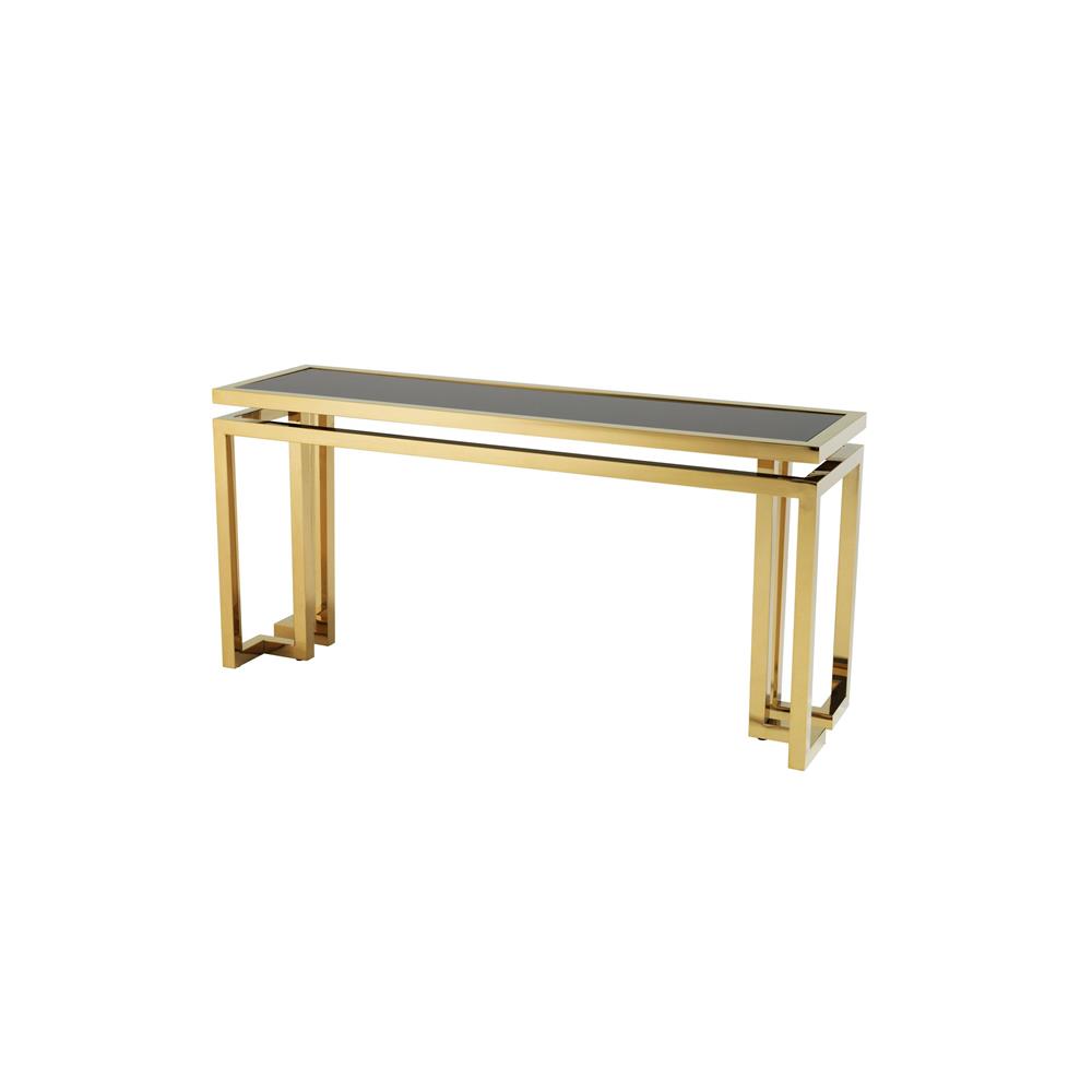 Zlatý vysokoleštený oceľový konzolový stolík Palmer s čiernym sklom.