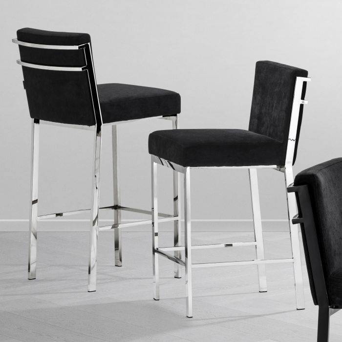 Čierna zamatová barová stolička Scott s nožičkami z vysokoleštenej ocele.