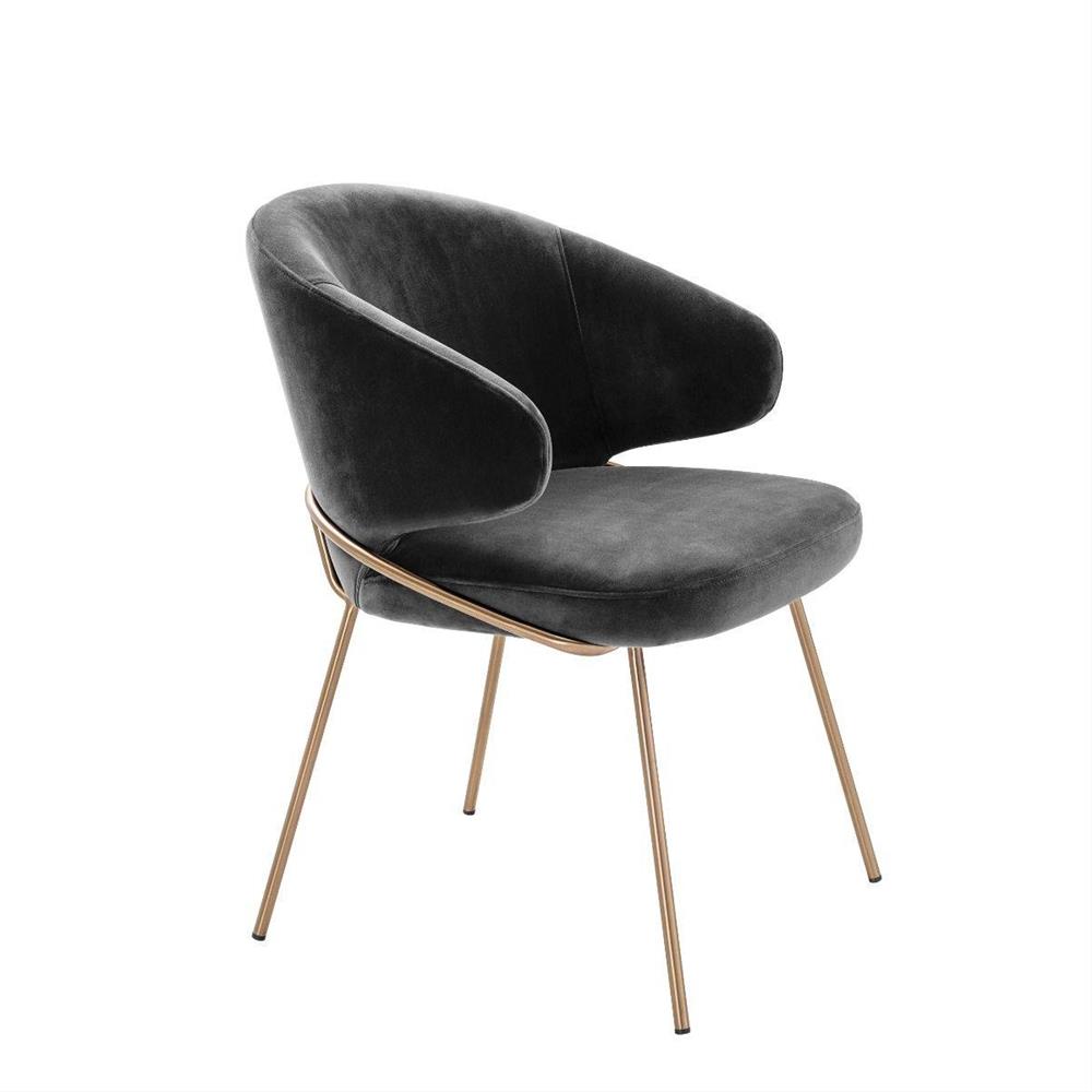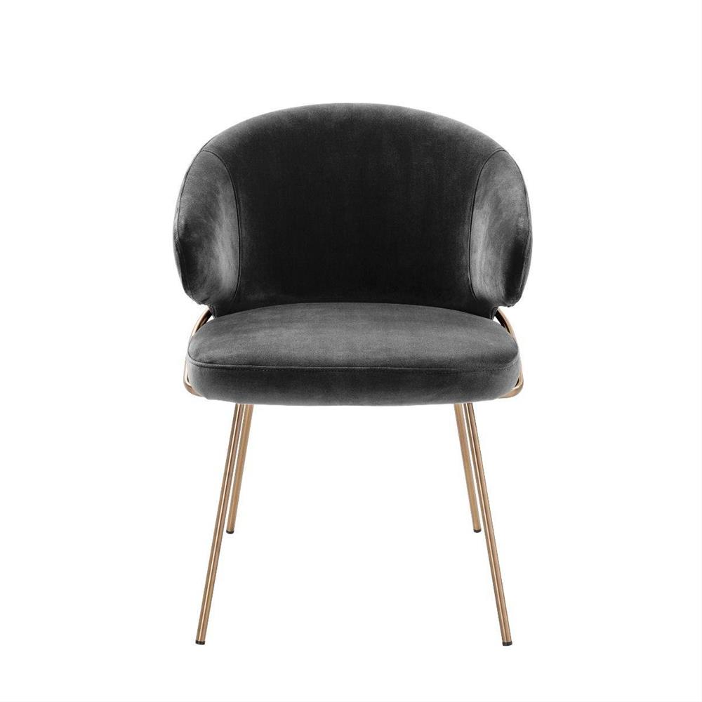 Zamatová stolička Kinley v tmavo-sivej farbe s mosadznými zlatými nožičkami.