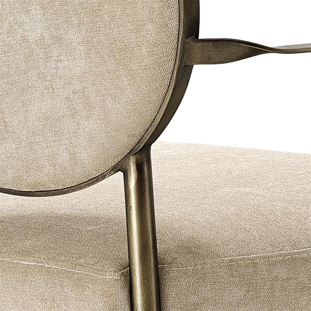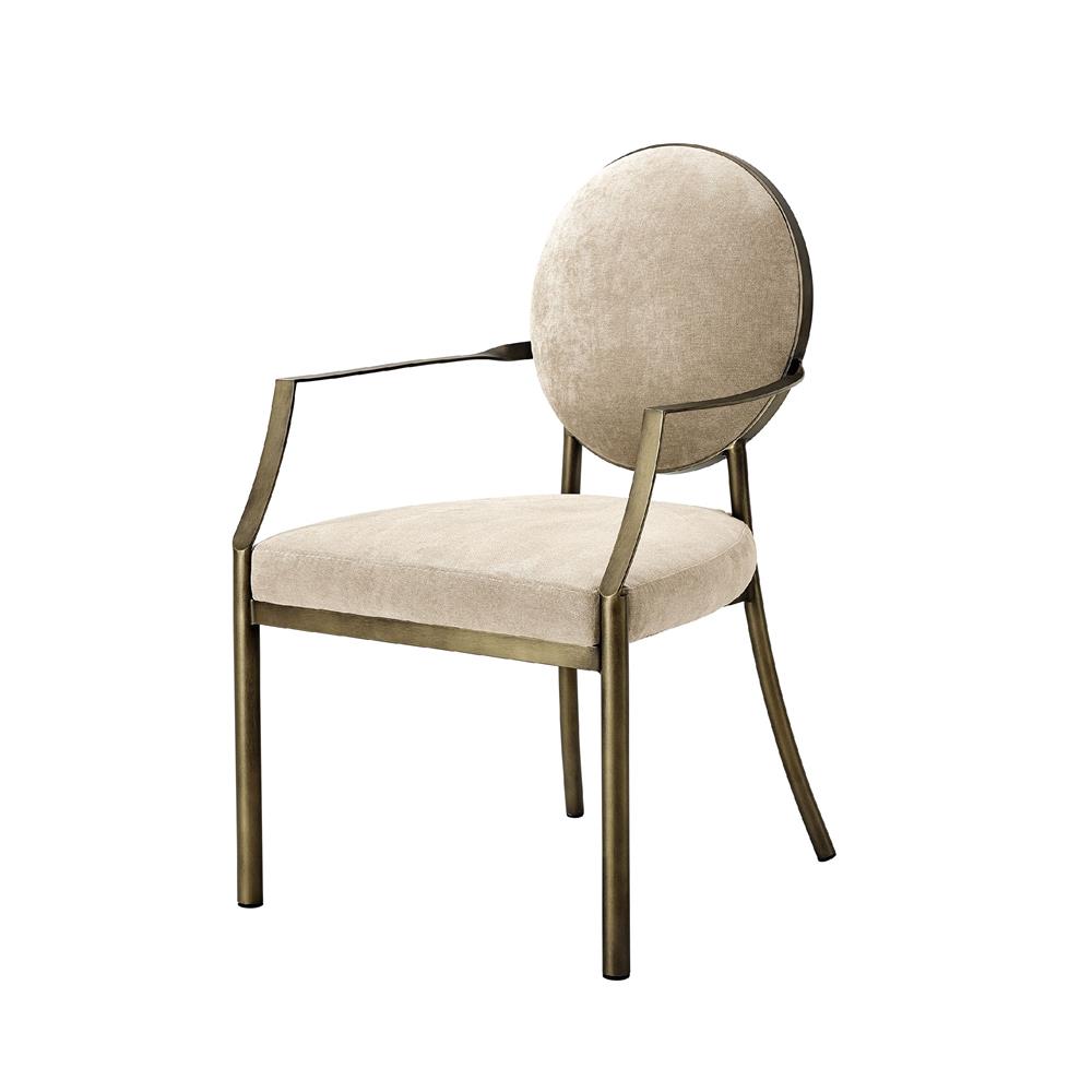 Svetlá zamatová stolička s opierkami Scribe s eukalyptovým masívnym základom a tmavým mosadzným kovovým rámom.