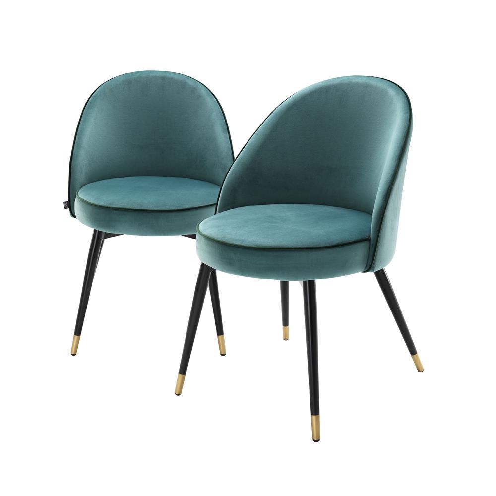 Set dvoch tyrkysových zamatových stoličiek Cooper s čiernymi nožičkami a mosadznými špičkami.