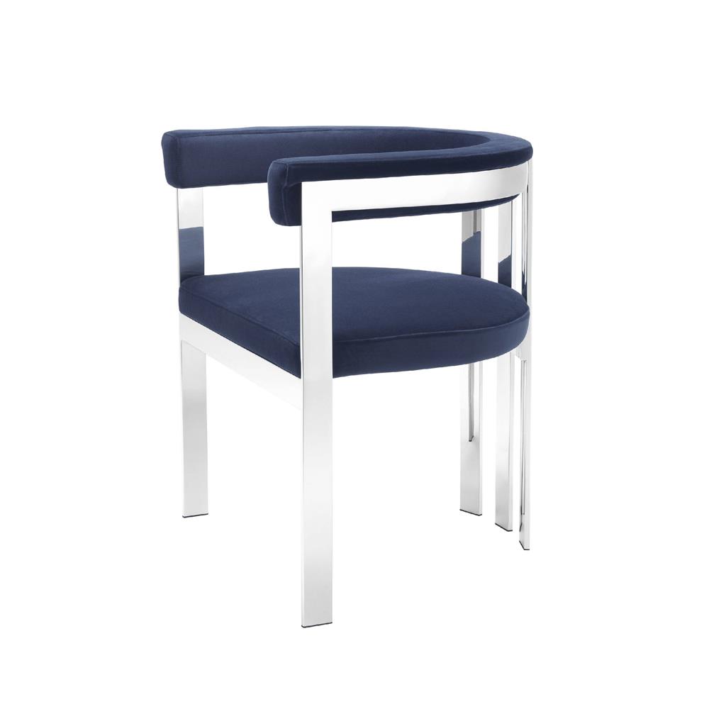 Stolička Clubhouse s tmavomodrým zamatovým čalúnením a vysokoleštenými oceľovými nohami.