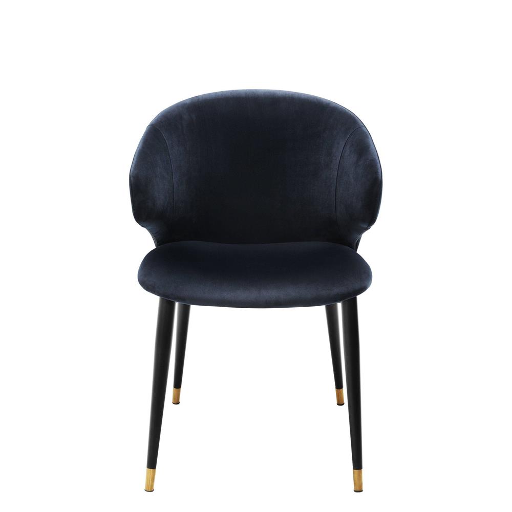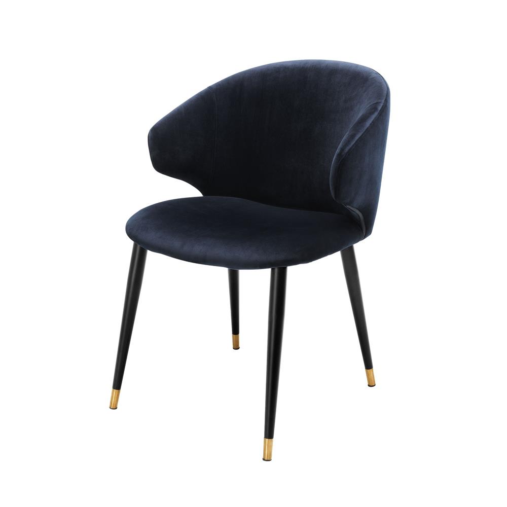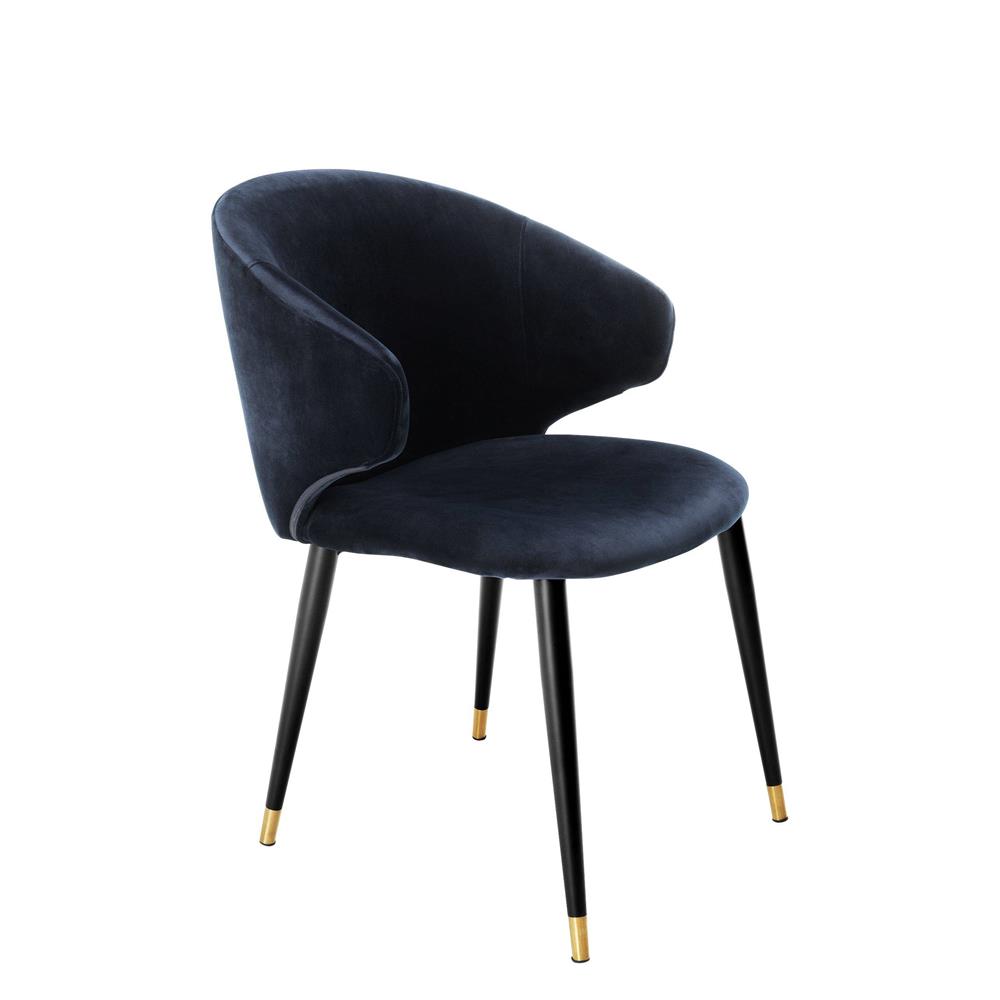 Tmavomodrá zamatová stolička Volante s čiernymi nožičkami a zlatými špičkami.