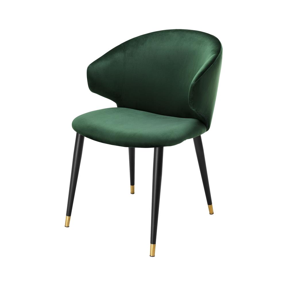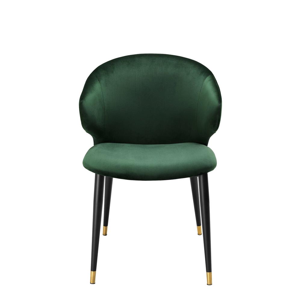 Tmavozelená zamatová stolička Volante s čiernymi nožičkami a zlatými špičkami.
