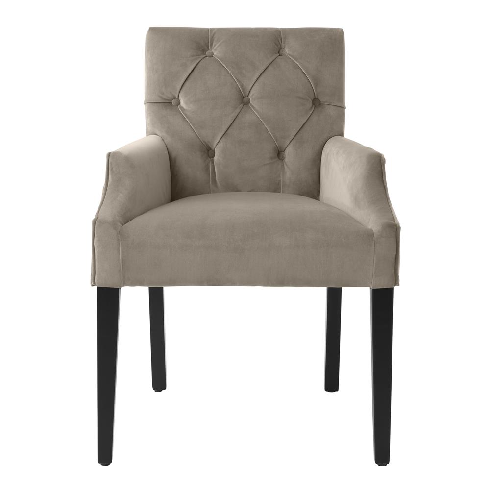 Komfortná zamatová stolička Atena s gombíkmi a čiernymi nožičkami.