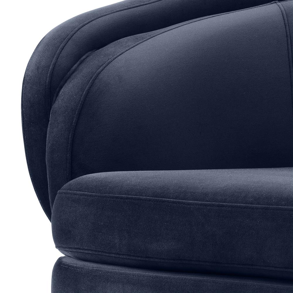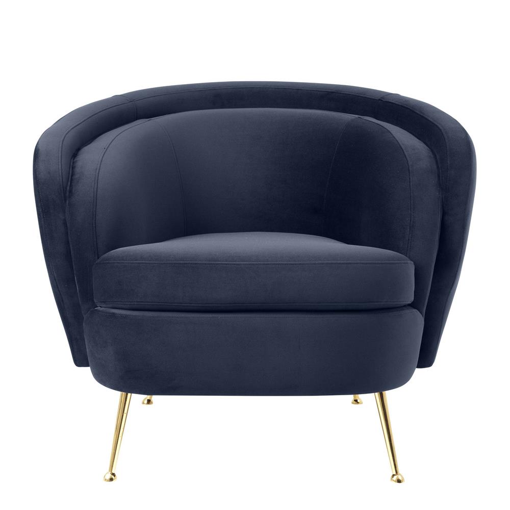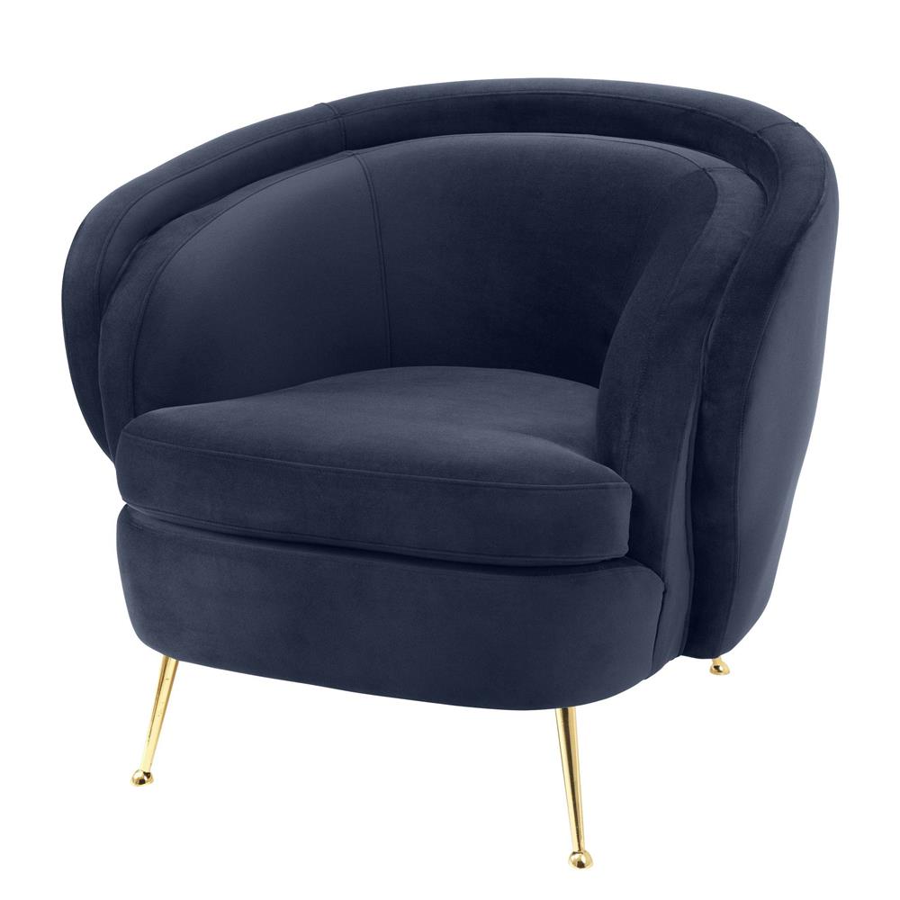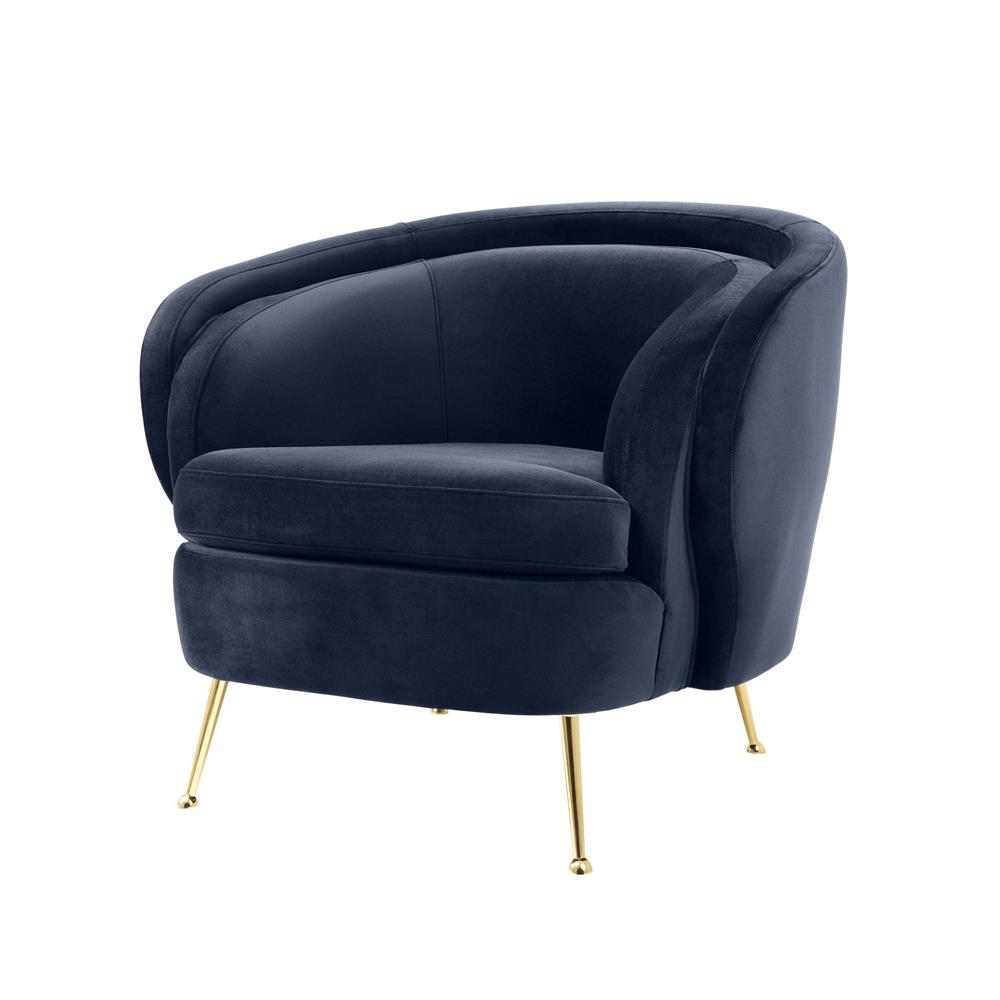 Tmavomodré zamatové kreslo Orion so zlatými nožičkami.