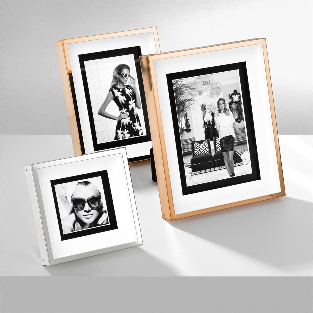 Zlatý fotorámik Gramercy s priehľadným sklom a čierno-bielym pozadím.