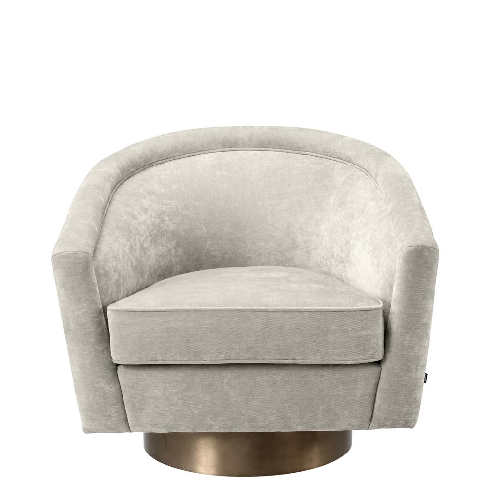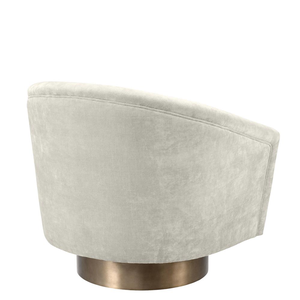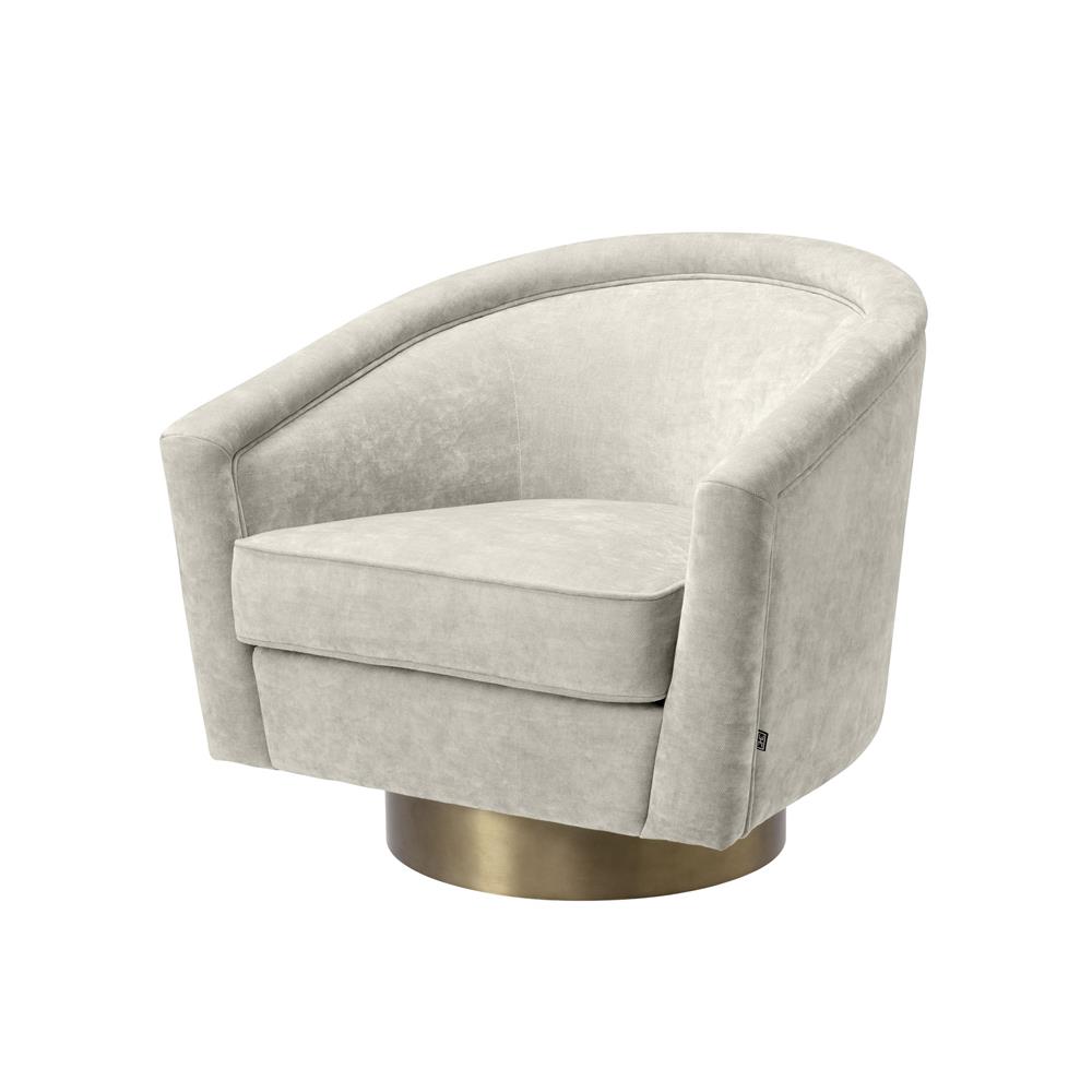 Otáčacie kreslo Catene so svetlým pieskovým zamatovým čalúnením a okrúhlou matnou zlatou nohou.