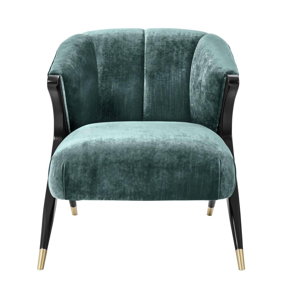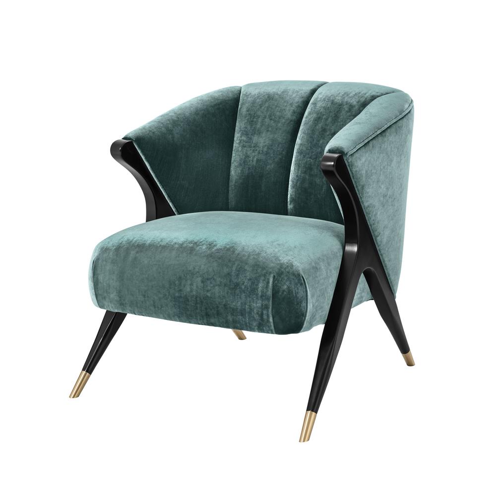 Elegantné zamatové kreslo Pavone s čiernymi nožičkami a zlatými špičkami.