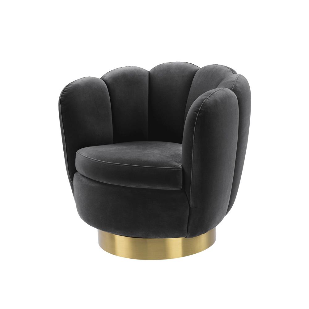 Otáčacie čierne zamatové kreslo Mirage s obľúbeným art deco dizajnom v tvare mušle so zlatou matnou nohou.