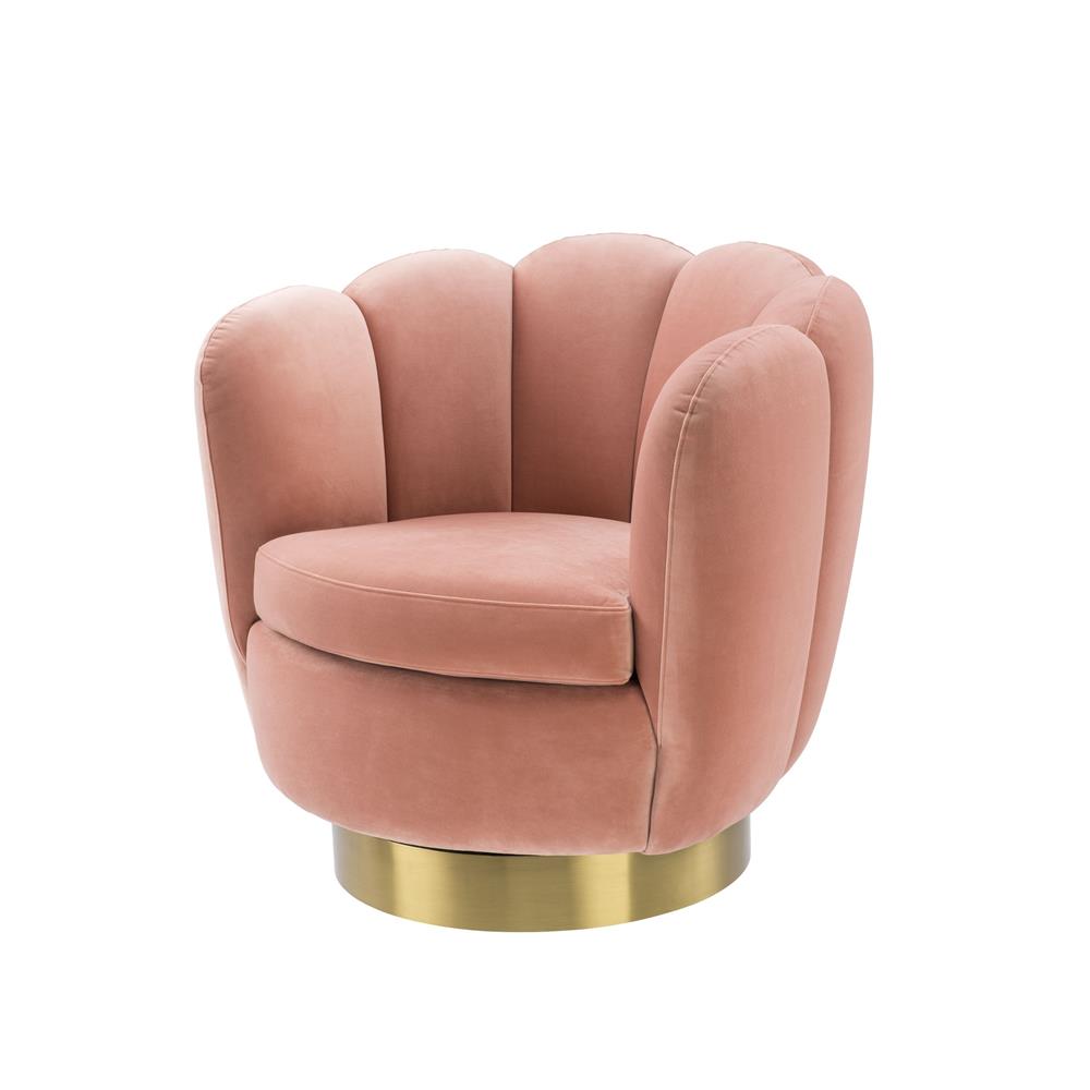 Otáčacie pudrovo-ružové zamatové kreslo Mirage s obľúbeným art deco dizajnom v tvare mušle so zlatou matnou nohou.