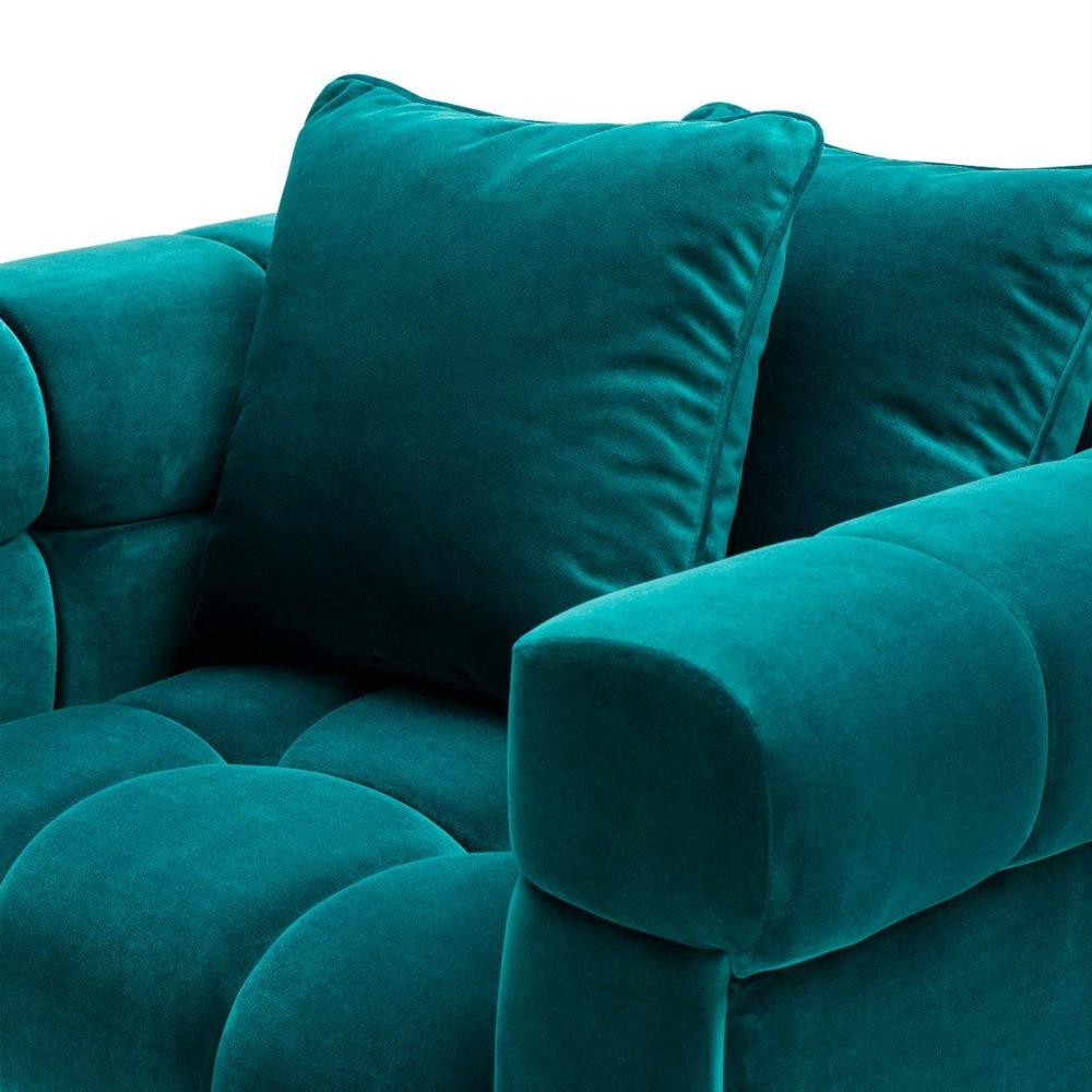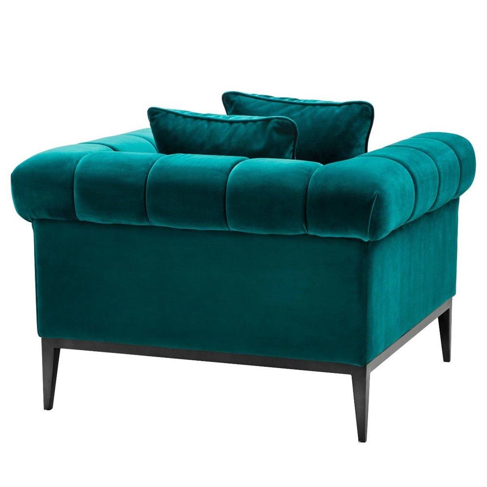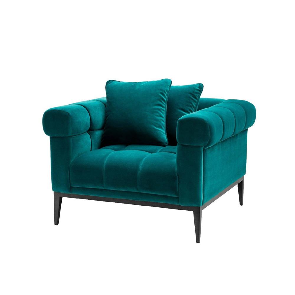 Glamour kreslo Aurelio s vankúšmi v sýtej tyrkysovej farbe s čiernymi nožičkami.
