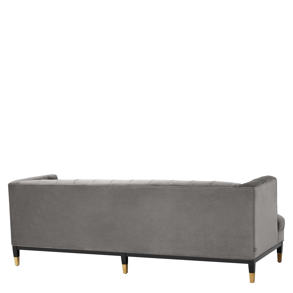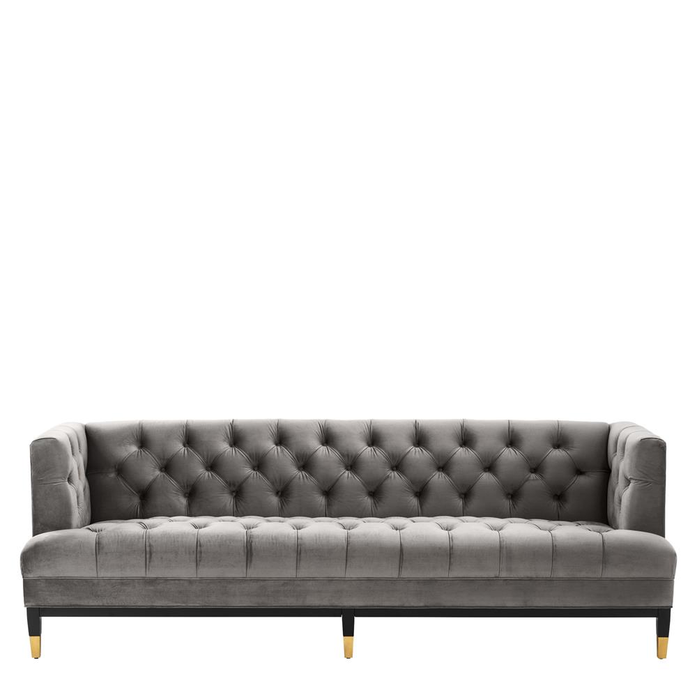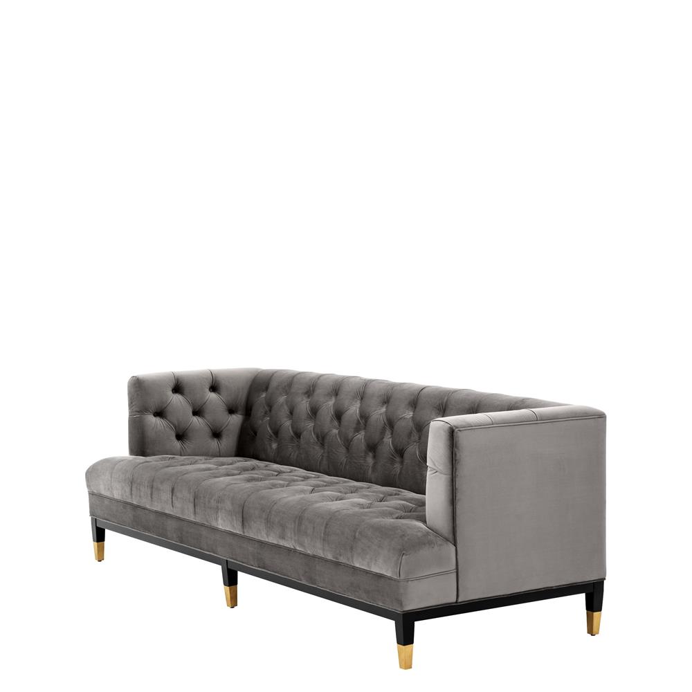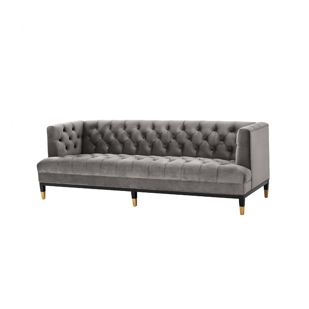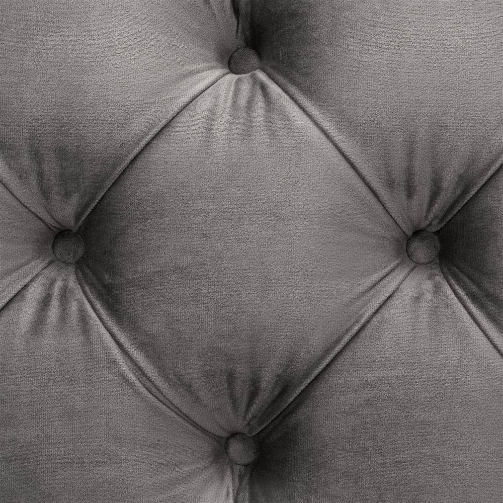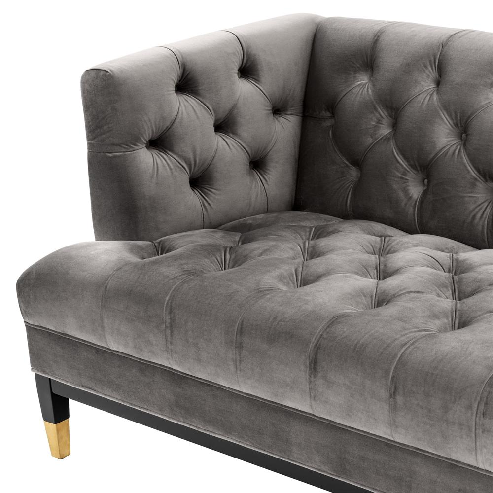 Sivá zamatová sedačka Castelle s gombíkovým dizajnom, čiernymi nožičkami a zlatými špičkami.