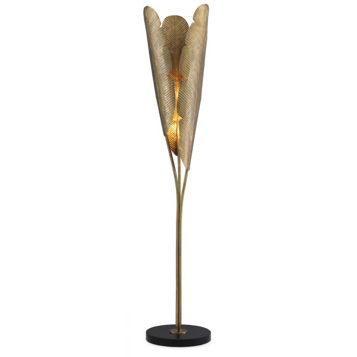 Podsvietená podlahová lampa s dizajnom palmových listov v mosadznom prevedení a čiernym granitovým základom.