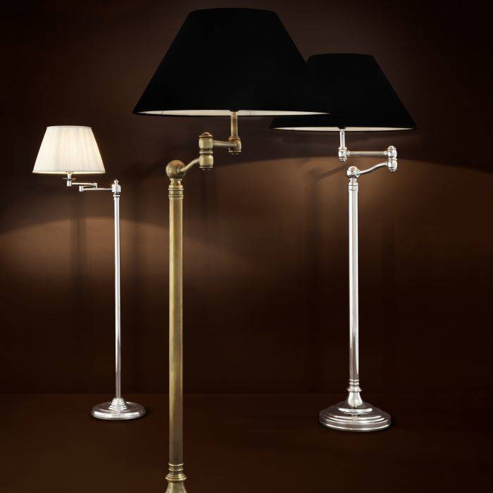Mosadzná podlahová lampa Regis s otočným ramenom a čiernym tienidlom.