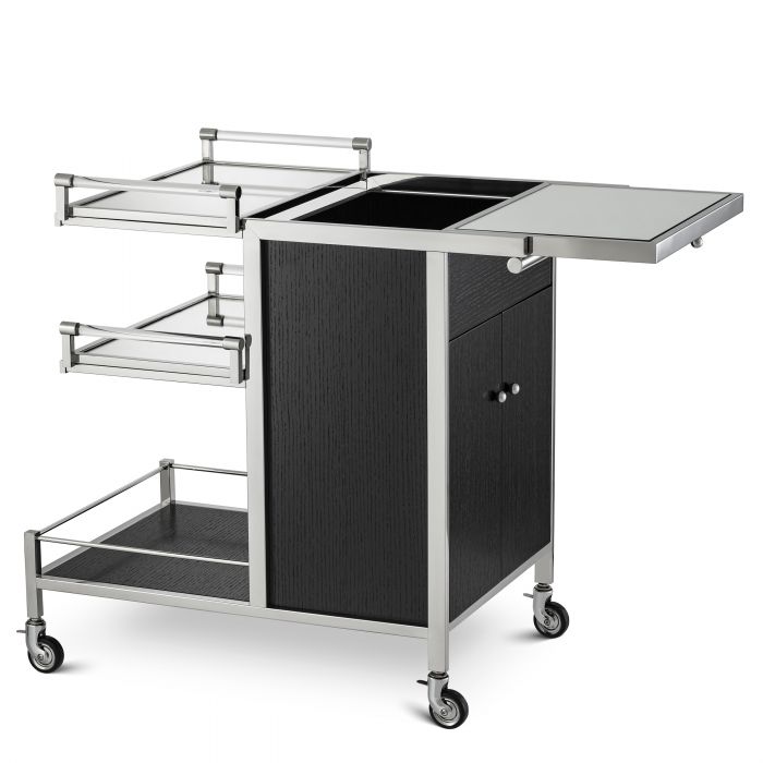 Barový vozík z vysokoleštenej ocele so zrkadlovými odnímateľnými podnosmi a úložnou skrinkou v čiernej dubovej dýhe.
