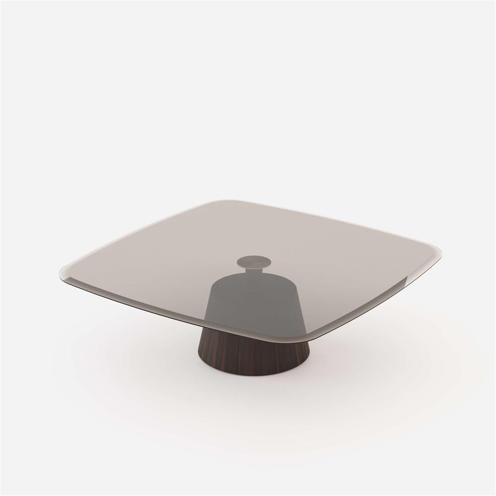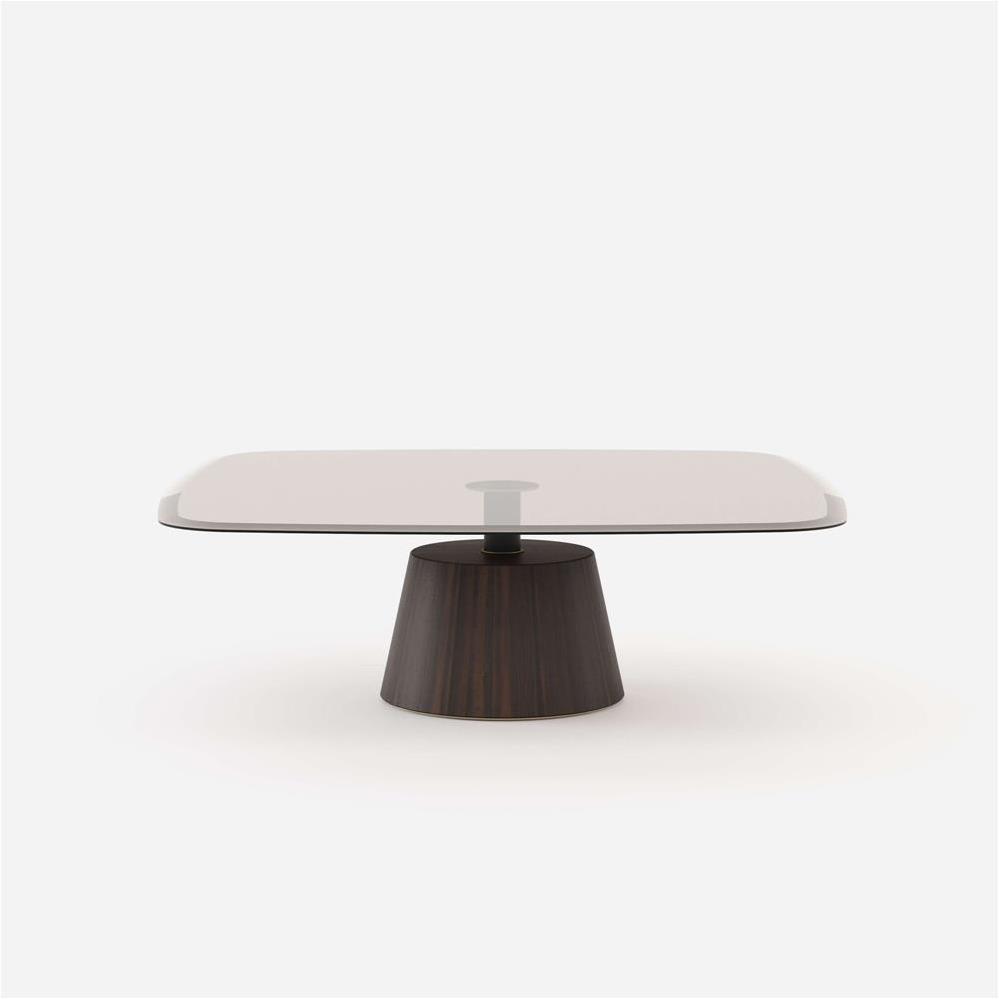 Dizajnový konferenčný stolík Panton s dreveným základom a sklenou vrchnou doskou.
