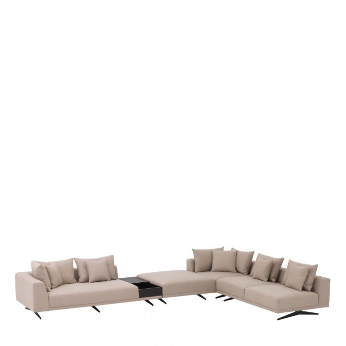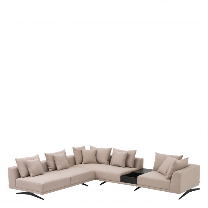 Táto mimoriadne štýlová pohovka má robustné čierne nohy a čalúnenie v pieskovom odtieni.
