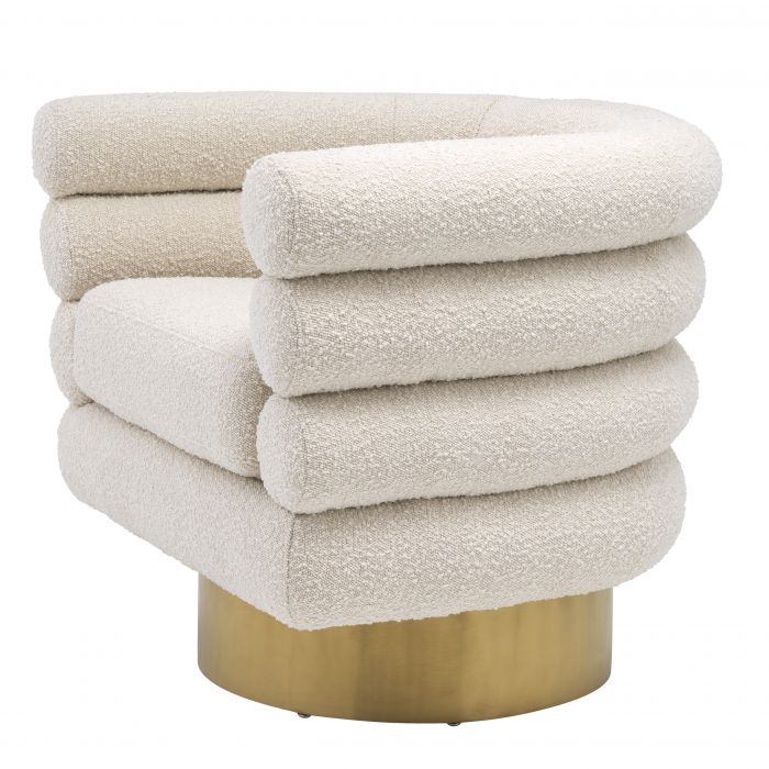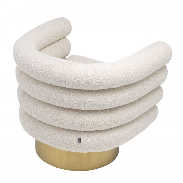 Stolička Maguire vyžaruje dotyk dekadencie svojím čalúnením bouclé a otočnou základňou z brúsenej mosadze.