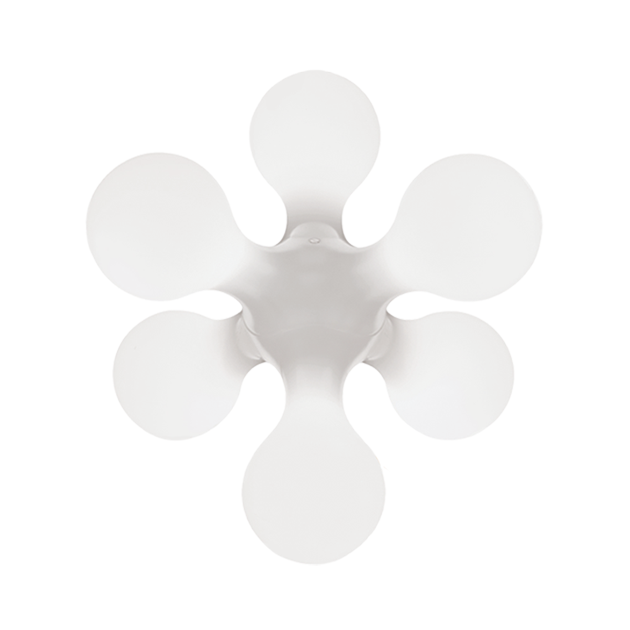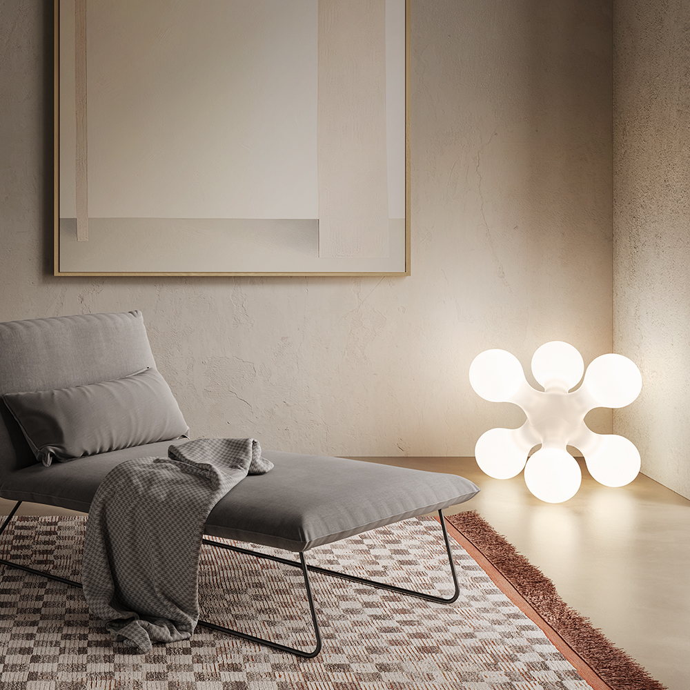 Stolová a stojaca dizajnová lampa Atomium s rotačne tvarovaným polyetylénovým difúzorom a vnútornou konštrukciou so šiestimi zdrojmi svetla (6x E14) pripevnenými na oceľových pružinách.