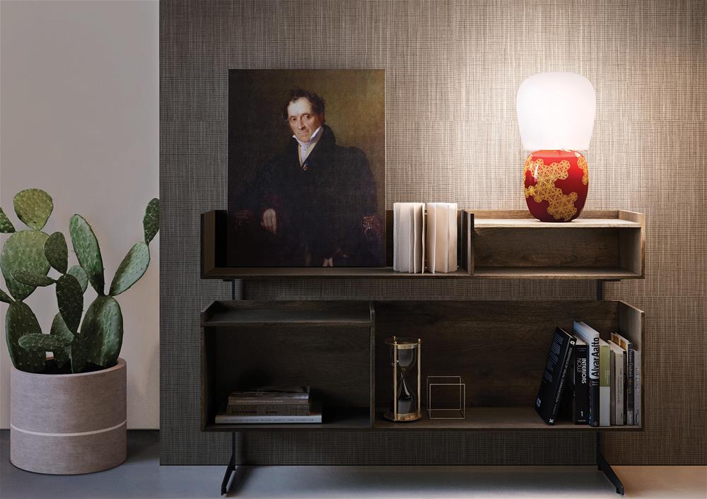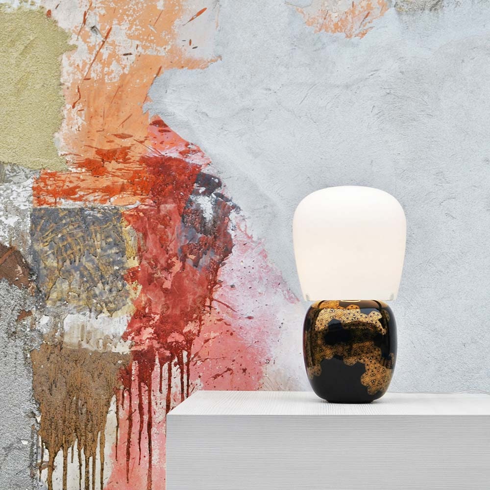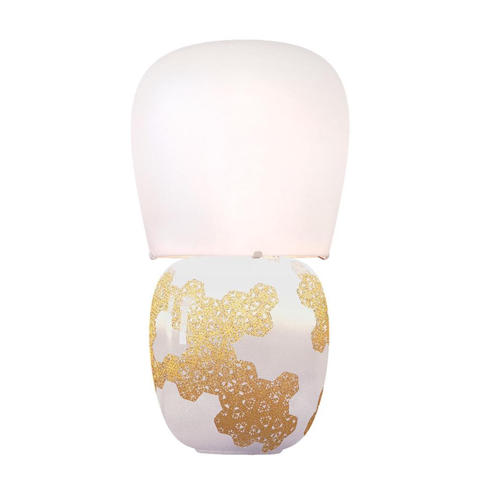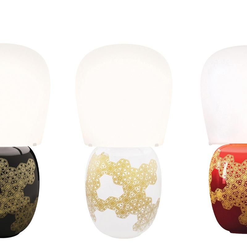 Stolová lampa Hive s opálovým tienidlom z dvoch vrstiev fúkaného skla a smaltovaným keramickým telom zdobeným "third firing" technikou.