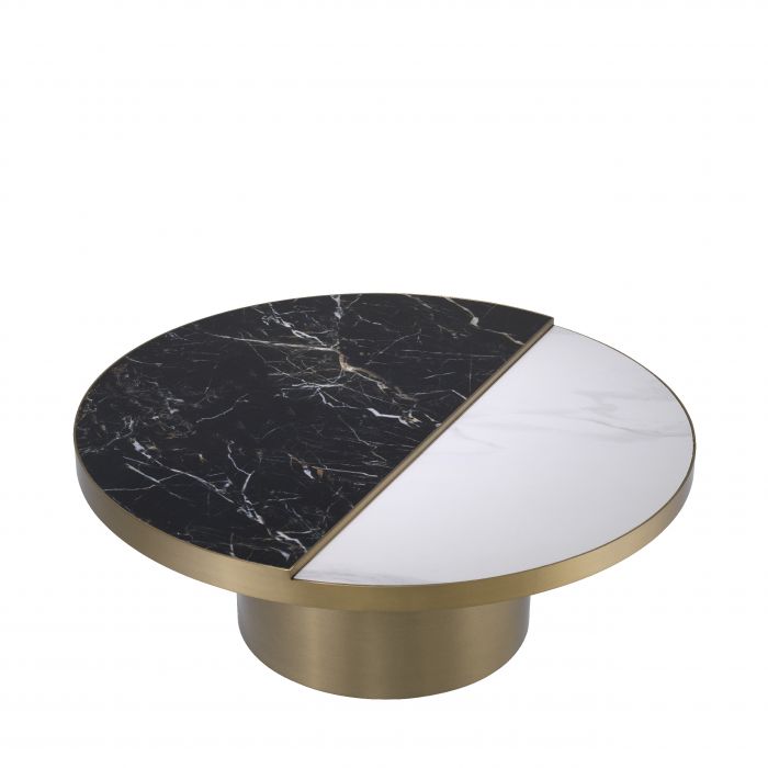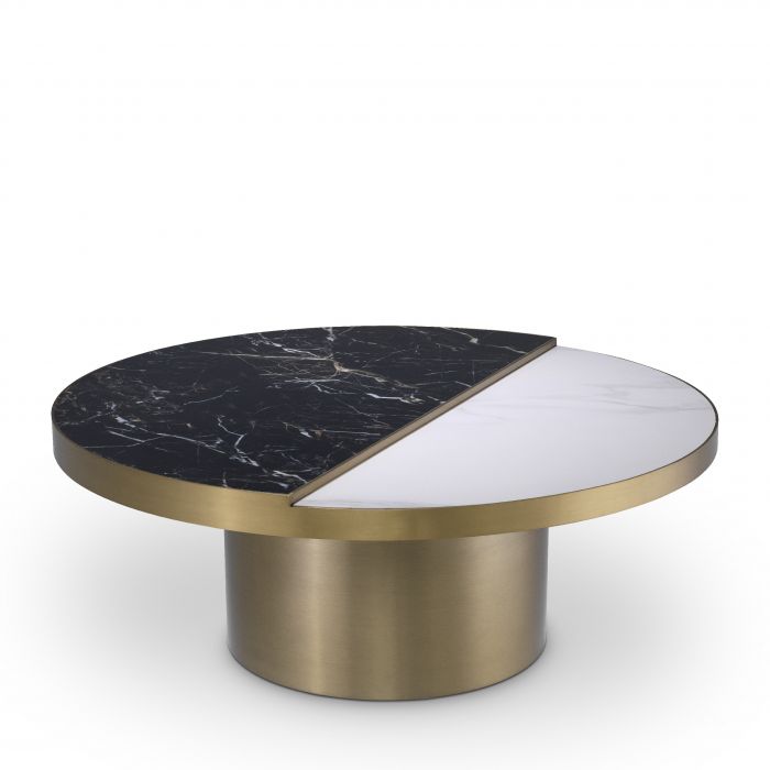 Časť z čierneho mramoru je mierne väčšia a vyvýšená ako biela časť stolíka. Podstavec a okraj tohto pozoruhodného kúsku majú povrch z brúsenej mosadze.