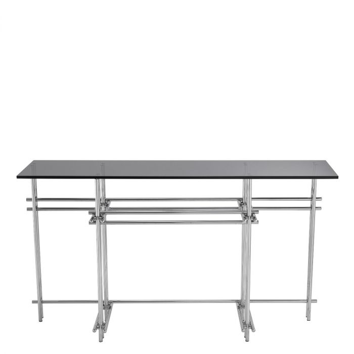 Tento konzolový stôl s elegantnou doskou z dymového skla dodá každému luxusnému vnútornému priestoru nádych dekadencie a dizajnu. Skombinujte s zrkadlom Quinn z leštenej ocele.