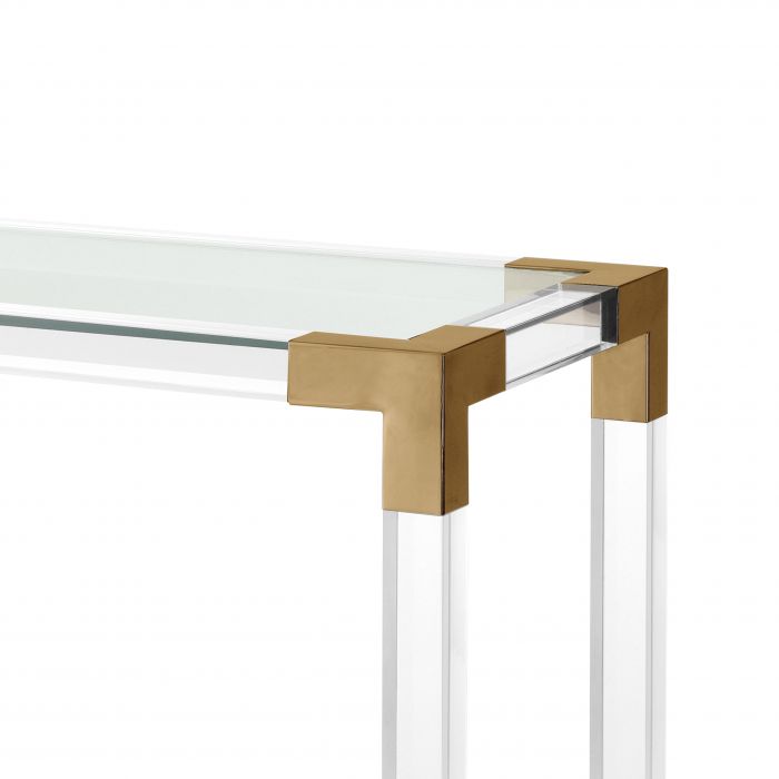 Jeho číry akrylový rám je vybavený vrchnou doskou a dolnou policou z číreho skla. Rohy a nohy s povrchovou úpravou z brúsenej mosadze dotvárajú modernú estetiku.