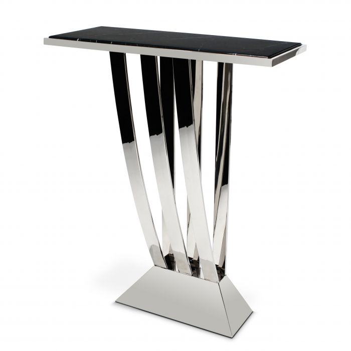Vytvorte vo svojom interiéri monochromatický efekt s konzolovým stolom Beau Deco. Skladá sa z unikátneho rámu z leštenej oceľe s veľkou, robustnou základňou a vystupujúcimi lamelami na oboch stranách. Obdĺžniková doska stola má čierny mramorový povrch.