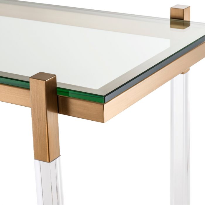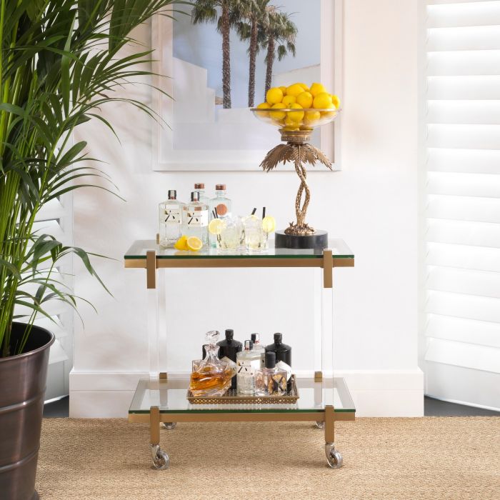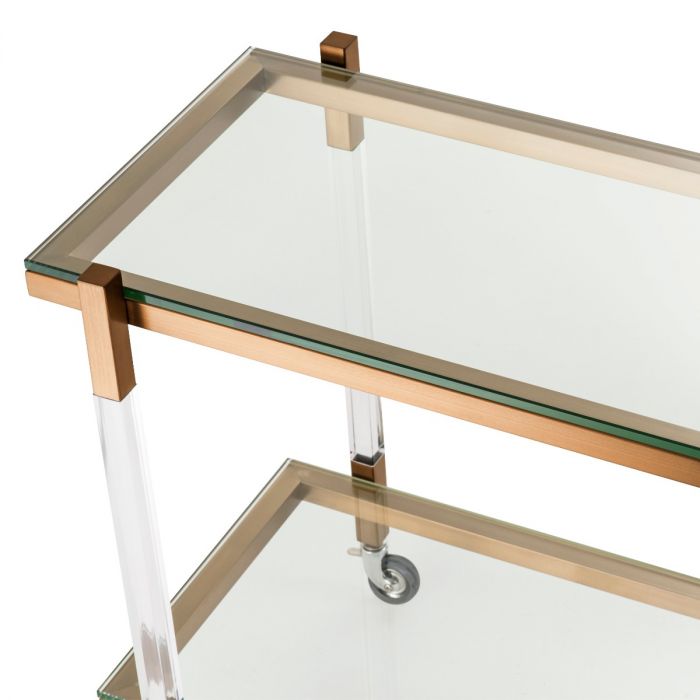 Príručný barový vozík Royalton v matnom mosadznom prevedení s čírom sklom a akrylovými nožičkami.