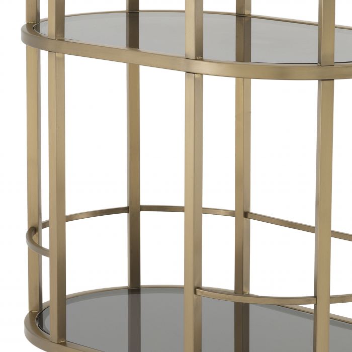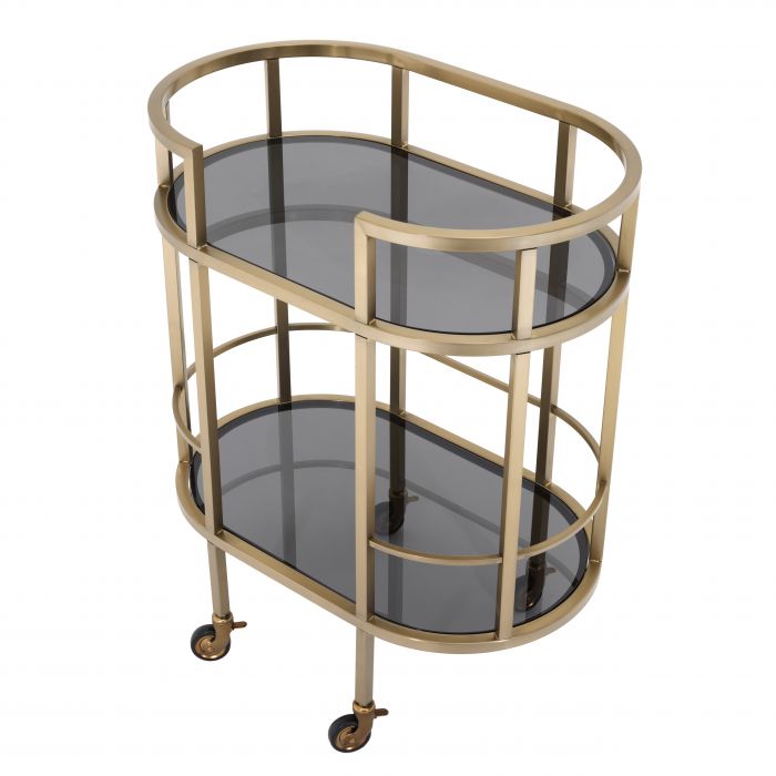 Príručný barový vozík Townhouse v matnom mosadznom prevedení s dymovým sklom.