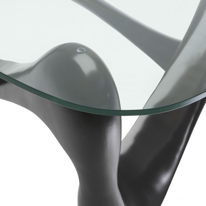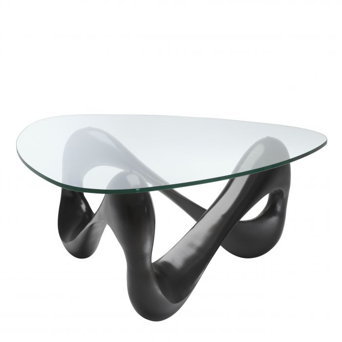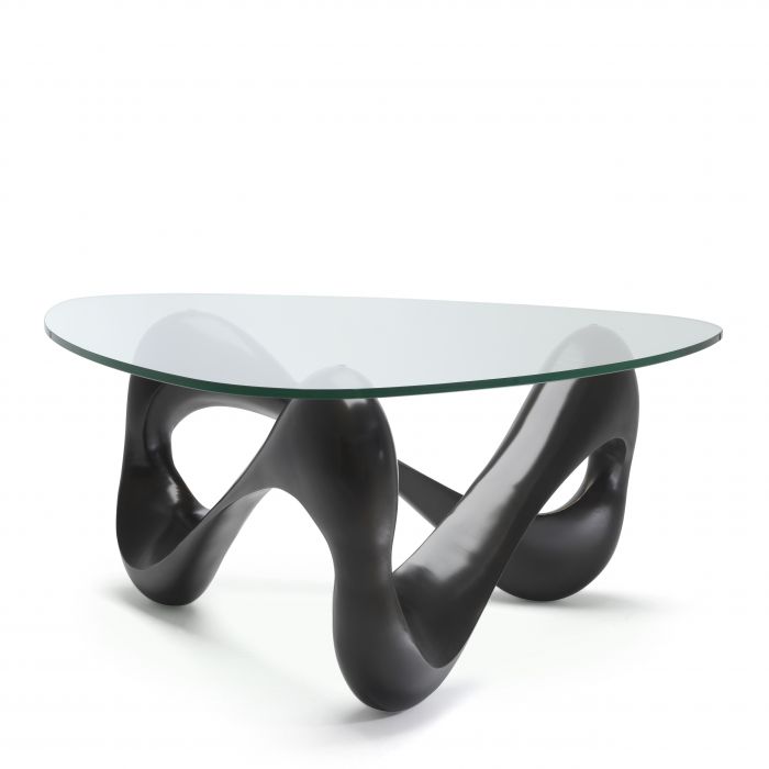 Konferenčný stolík Aventura je skutočným umeleckým dielom! Skladá sa z vlnitej bronzovej základne v jednom kuse a trojuholníkovej sklenenej dosky so zaoblenými rohmi.