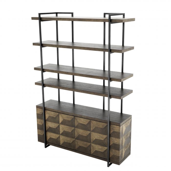 Vitrína Gregorio s úložnou skrinkou v dubovej dýhe a bronzovými kovovými piliermi.