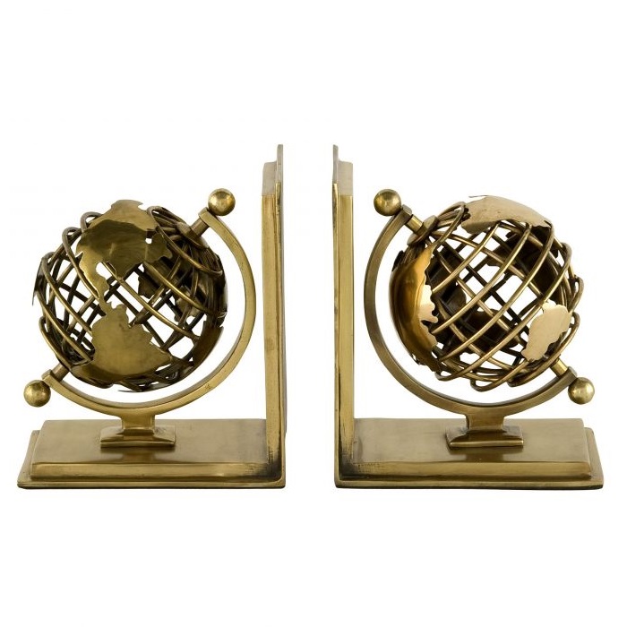 Mosadzné zarážky na knihy Globe s glóbusmi.
