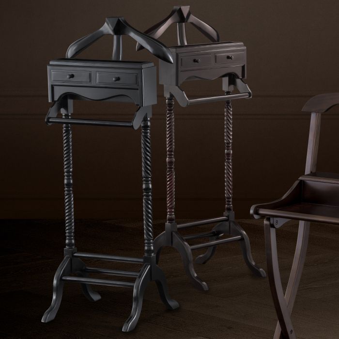Masívny drevený nemý sluha Jaquet v tmavo-hnedom prevedení s dvomi úložnými zásuvkami.
