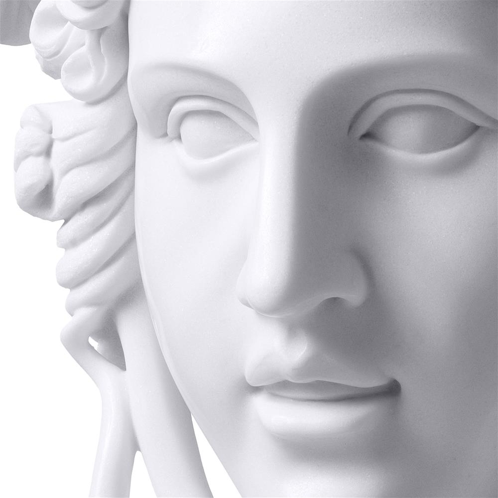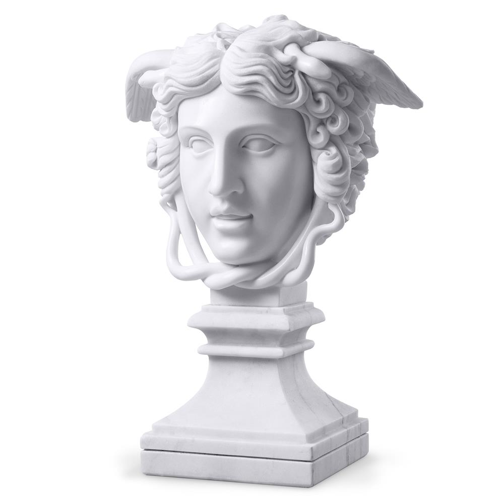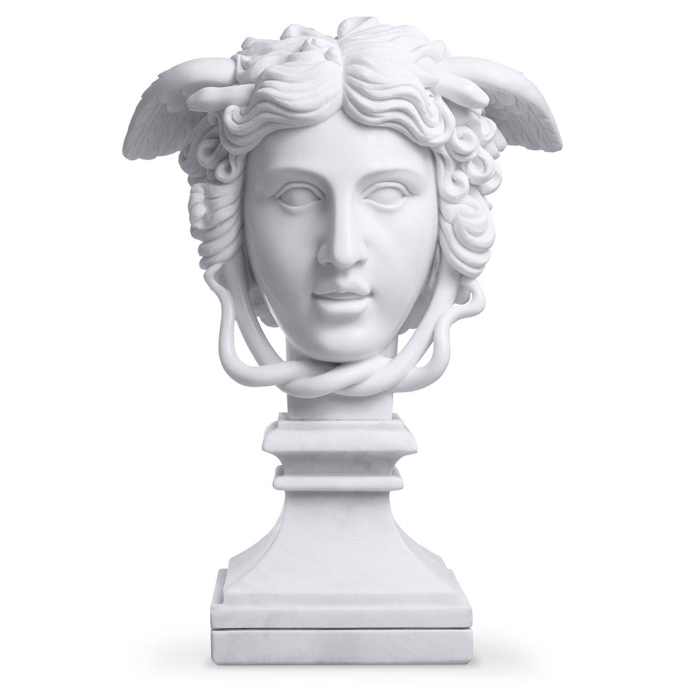 Medusa je zvyčajne predstavená ako okrídlené ženské stvorenie s hlavou pozostávajúcou s vlasmi z hadov a je najznámejšou z troch gorgónskych príšer z gréckej mytológie. Táto klasická socha je vyrobená z bieleho mramoru a má štvorcovú základňu s reliéfnym okrajom.