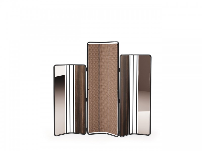 Spojenie kovovej rúrkovej konštrukcie, ktorá zahŕňa drevené, zrkadlové a látkové panely.