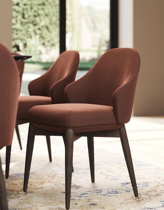Nohy jedálenských stoličiek Bonsai sú z masívneho dreva, čalúnenie zamat.